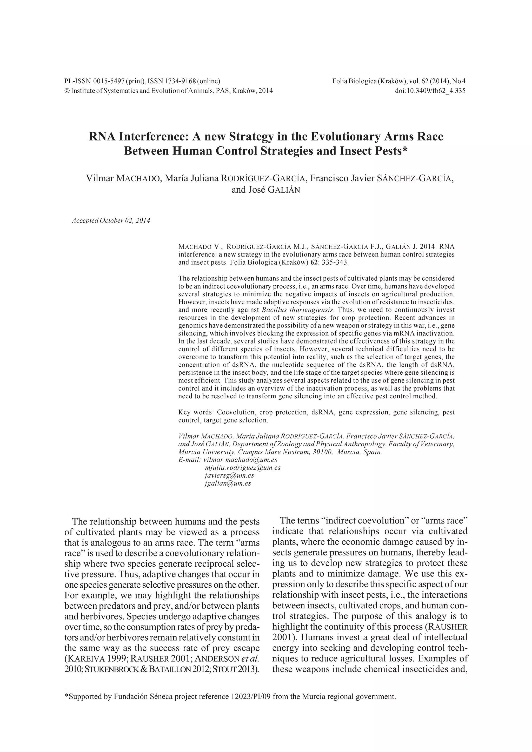 The relationship between humans and insect pests can be viewed as an evolutionary arms race, where each group develops strategies in response to changes in the other over time. Recent advances in genomics have revealed a new potential strategy for humans - gene silencing using RNA interference (RNAi). RNAi involves blocking expression of specific insect pest genes to control populations. While studies show RNAi's effectiveness, challenges remain in delivering dsRNA to target cells and selecting optimal target genes. This document discusses the RNAi process, methods for dsRNA delivery including oral ingestion, and difficulties that must still be addressed to realize RNAi's potential as an effective pest control method.