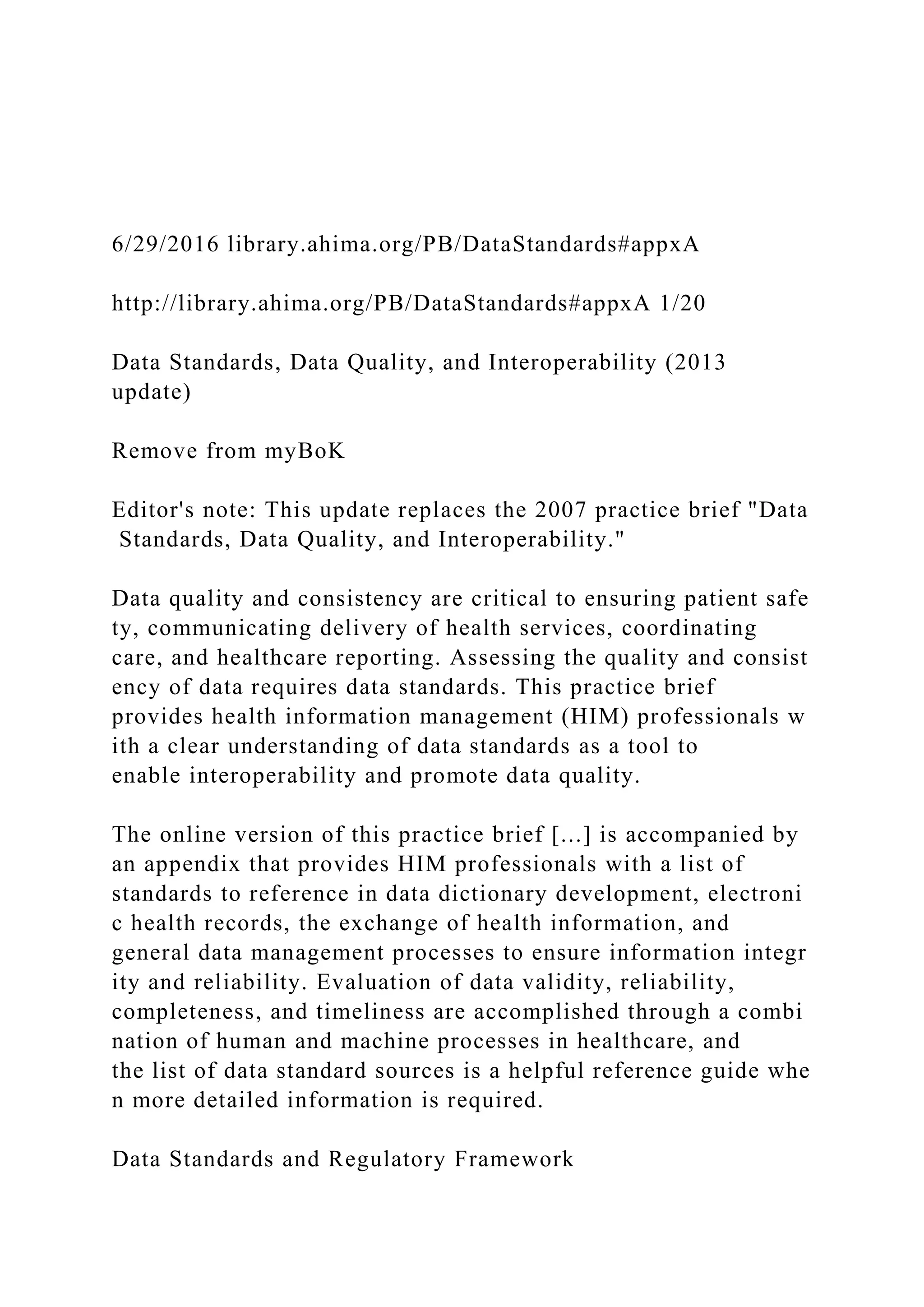 This practice brief outlines the importance of data standards, data quality, and interoperability in healthcare, aimed at ensuring patient safety and enhancing care coordination. It emphasizes the role of health information management professionals in adopting and implementing data standards to enable effective health information exchange and improve healthcare delivery. Key components include collaboration with various stakeholders, regulatory compliance, and the integration of standardized language for clinical data management.