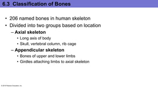 2) Bones are also classified by their shape into four categories: long bones are longer than wide and found in the limbs, short bones are cube-shaped in the wrist and ankle, flat bones are thin and curved like those in the skull, and irregular bones have complicated shapes like the vertebrae and hip bones.