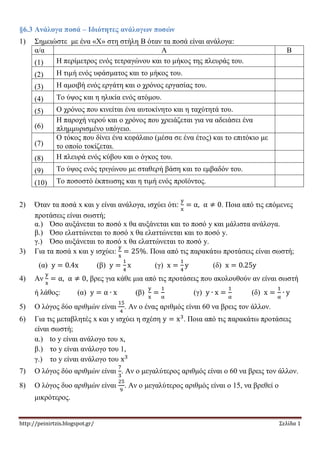 1) Σημειώστε με ένα «Χ» στη στήλη Β όταν τα ποσά είναι ανάλογα: