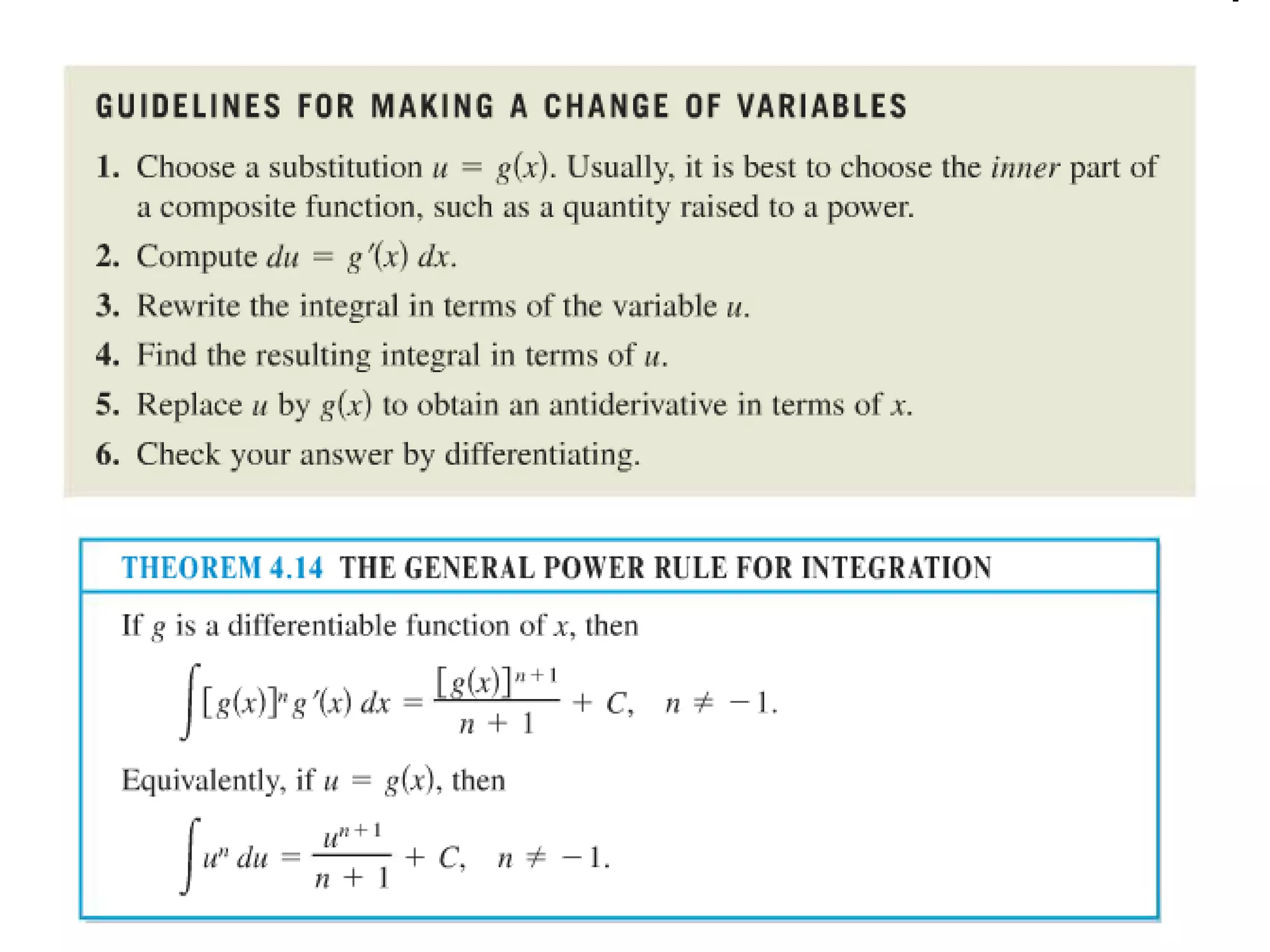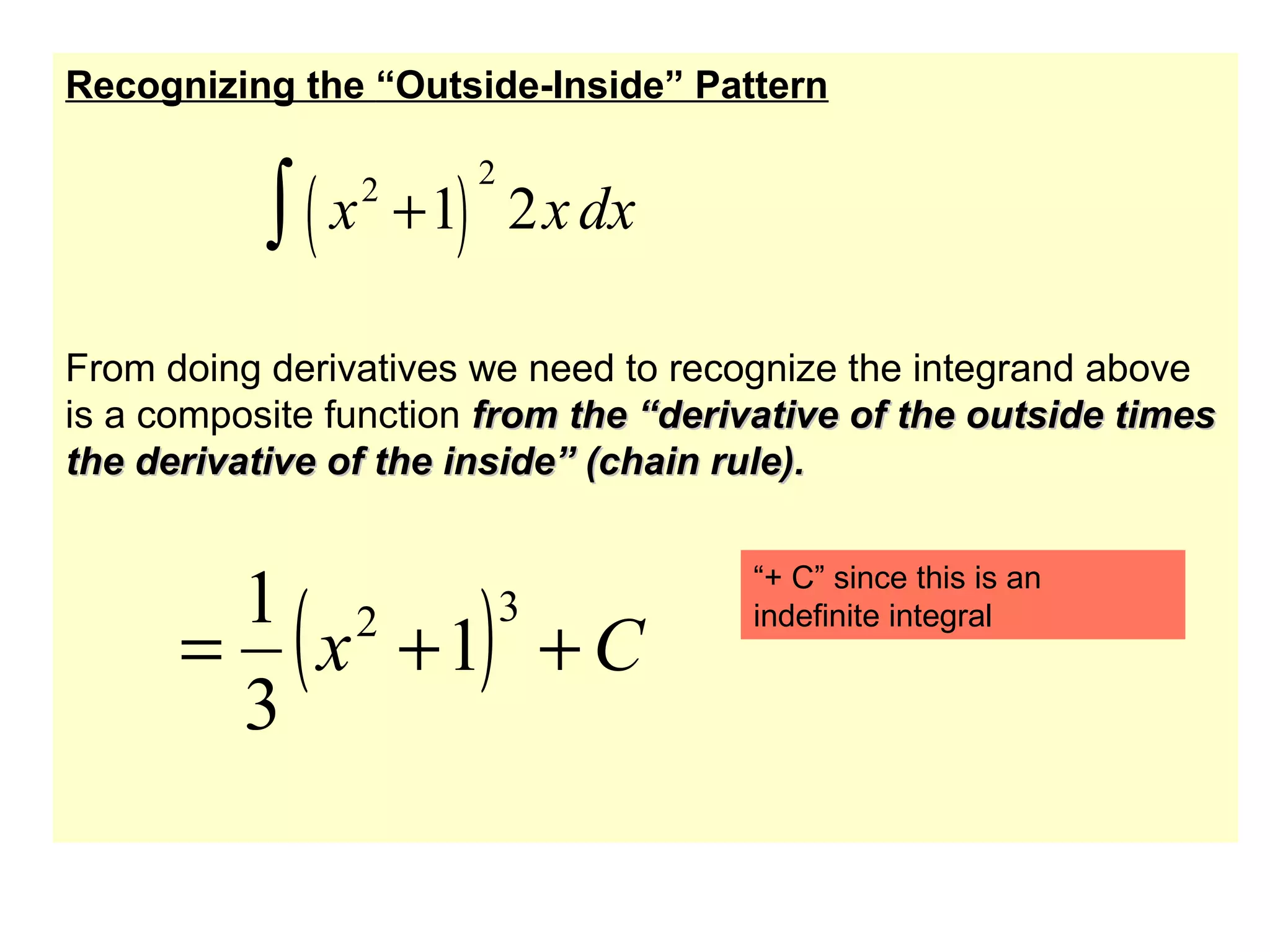 This document discusses integration by substitution. It provides an example of recognizing a composite function and rewriting the integral in terms of the inside and outside functions. Specifically, it shows rewriting the integral of (x2 +1)2x dx as the integral of the outside function (x2 + 1) with the inside function (x) plugged in, plus a constant. It then provides additional practice problems applying the technique of substitution to rewrite integrals in terms of u-substitutions.