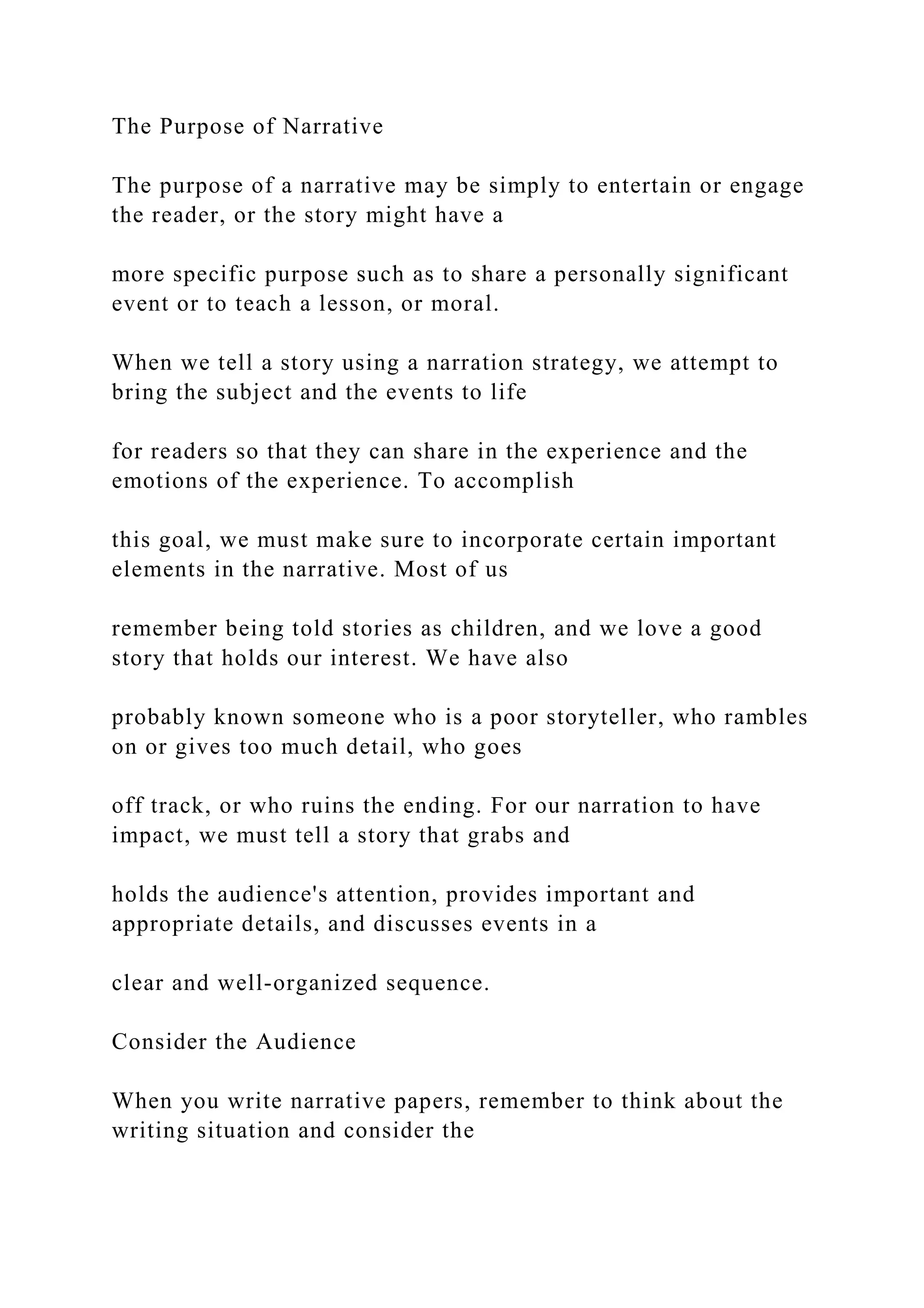 This document provides an overview of narrative writing and the key elements to include in a narrative. It discusses the purpose of narrative writing, which is often to entertain or engage readers but can also be to share a personal experience or teach a lesson. It outlines important narrative elements like plot, characters, setting, and creative tension. It also discusses organizing a narrative using chronological, spatial, or dramatic order. The document provides guidance on developing key parts of a narrative like the thesis, plot, dialogue, and maintaining a clear narrative structure.