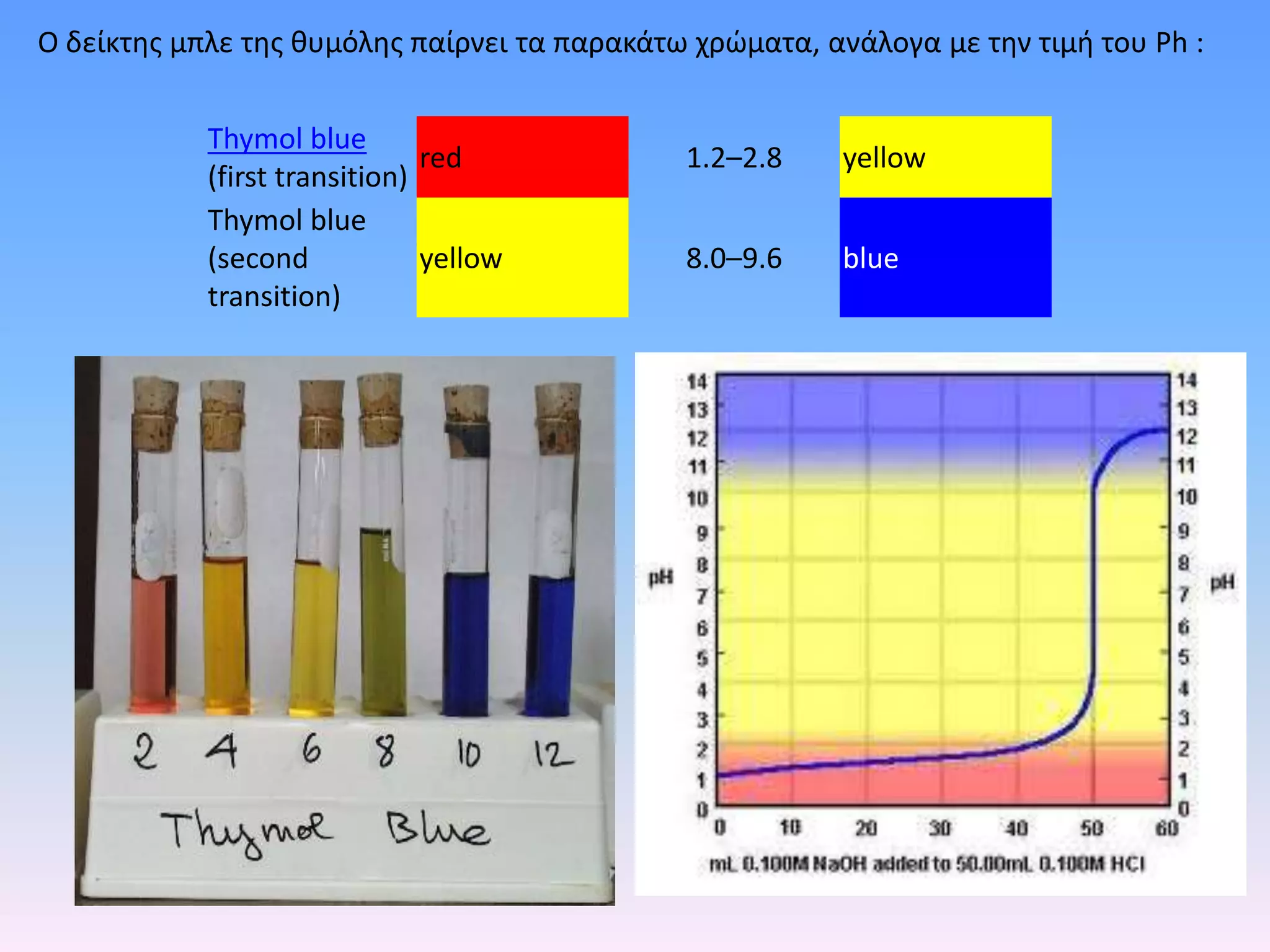 Ο δείκτης μπλετης θυμόλης παίρνει τα παρακάτω χρώματα, ανάλογα με την τιμή του Ph :