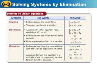 This document provides examples of solving systems of linear equations by elimination. It explains the steps:
