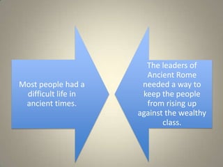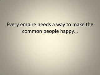 The ancient Romans kept the peace by providing the people with "Bread and Circuses". They distributed free wheat to the poor to prevent riots and hunger. This kept the people fed but hurt farmers with low crop prices. They also put on free circus shows with gladiator fights and executions to entertain the masses. The key lesson is that providing food and entertainment can help keep people complacent and at peace under the rule of an empire.