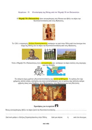 Ιστορία Ε΄ 6.31. ΄΄ Η ανάκτηση της Πόλης από τον Μιχαήλ Η΄, τον Παλαιολόγο ΄΄