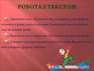 5. Прочитати текст мовчки. Визначити тему й основну думку. Дібрати