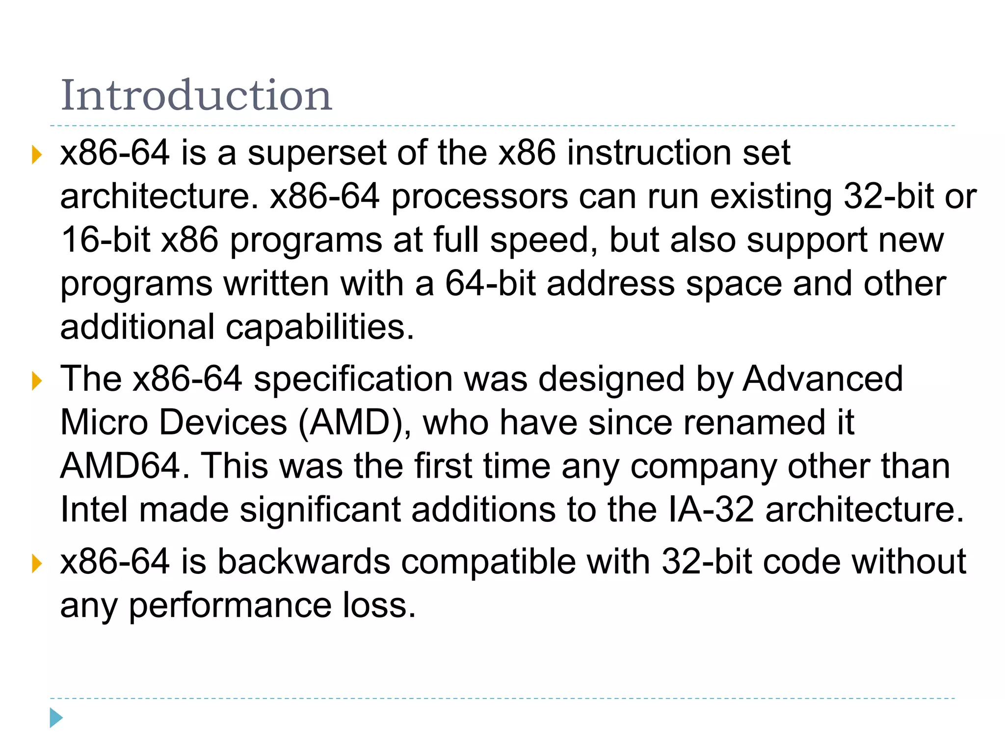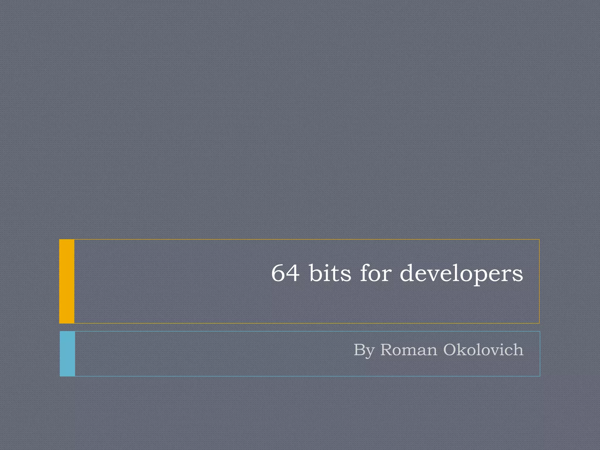 The document provides an overview of the x86-64 architecture, highlighting its backward compatibility with 32-bit systems, increased register capacities, and enhancements for 64-bit programming. Key features include greater virtual and physical address spaces, improved integer operations, and security enhancements like the no-execute bit. It also discusses compatibility considerations for developers and provides guidance on compiling 64-bit code using Visual Studio.