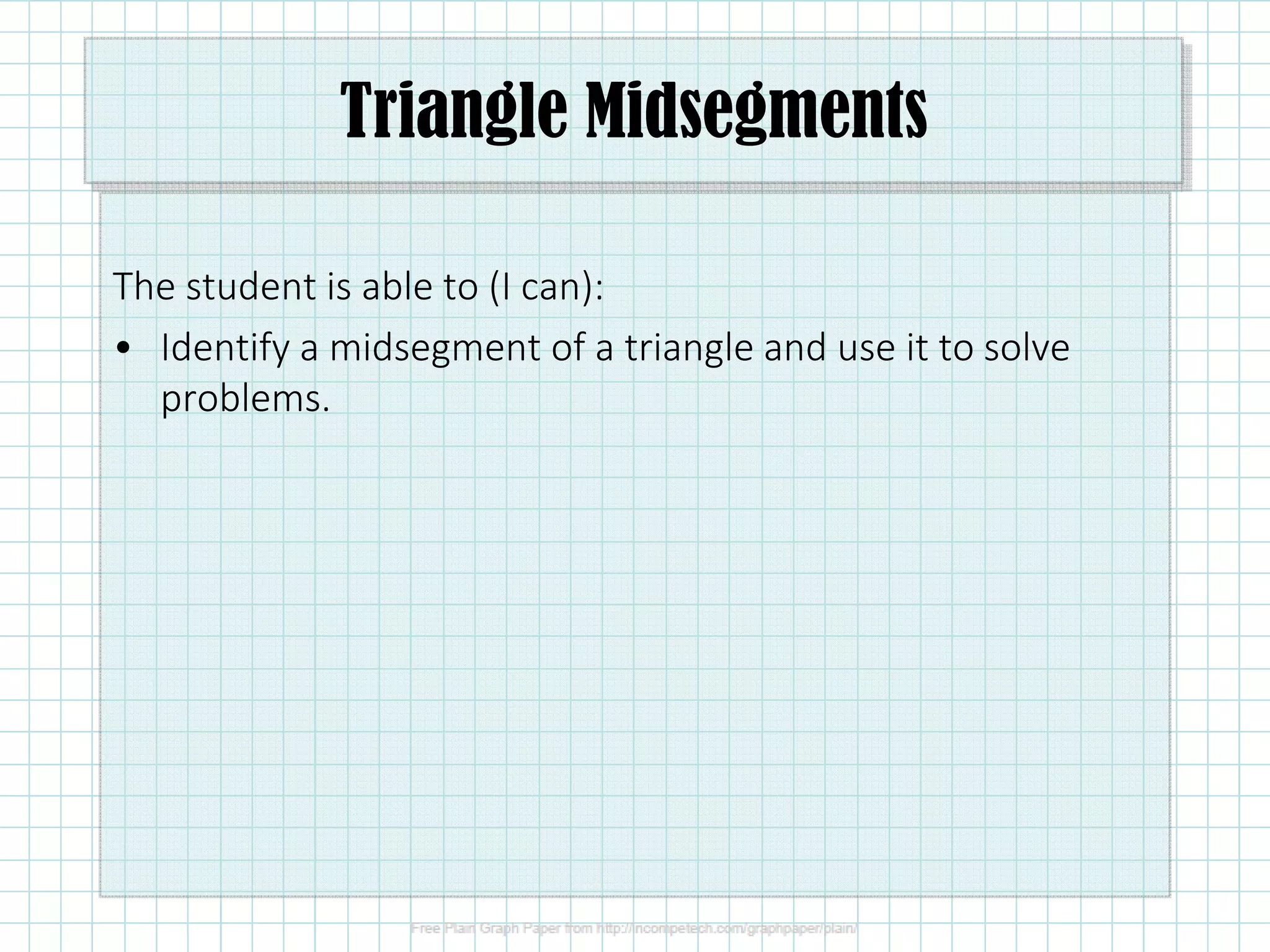 The document discusses triangle midsegments. A midsegment is a segment that joins the midpoints of two sides of a triangle. The Triangle Midsegment Theorem states that a midsegment of a triangle is parallel to a side of the triangle, and its length is half the length of that side. Examples are provided to demonstrate using the theorem to find the measures of lengths and angles associated with midsegments in triangles.
