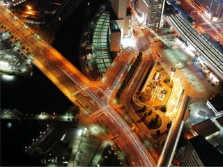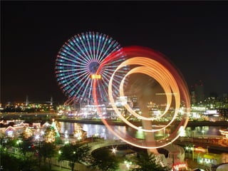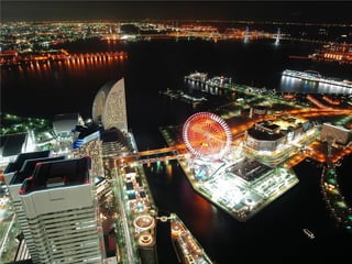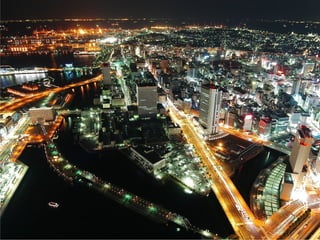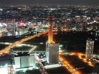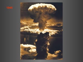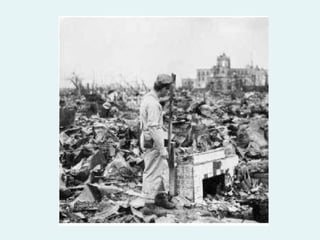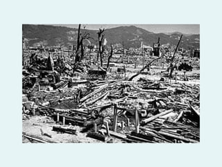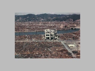 The document summarizes the progress made by the cities of Hiroshima and Nagasaki in the 64 years since they were destroyed by atomic bombs dropped by the United States in August 1945. It shows before and after photos of the cities highlighting how they have been rebuilt from the aftermath into colorful, modern cities today, including photos of Hiroshima's Peace Bell and Nagasaki's rebuilt Sasebo bridge.