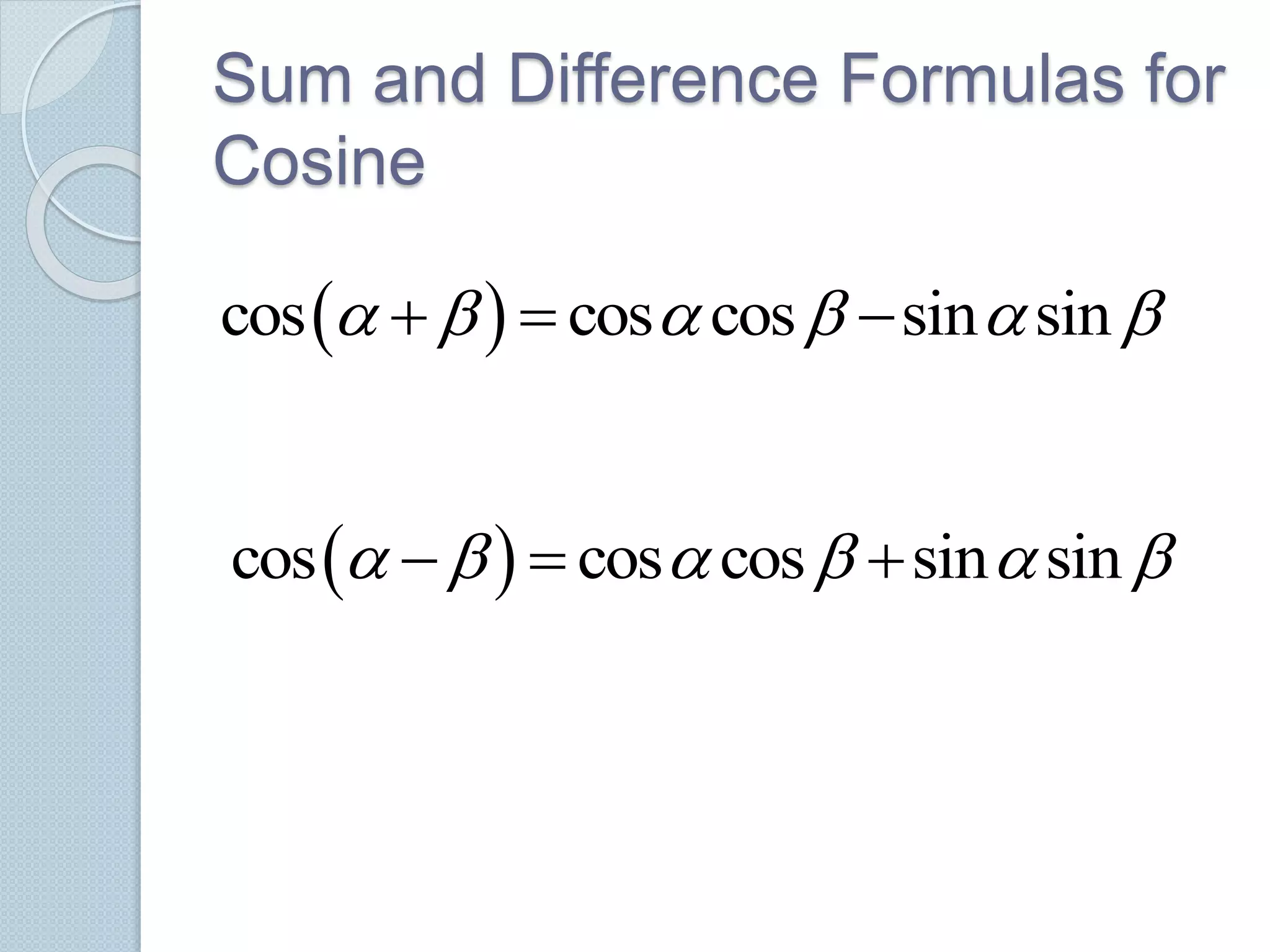 This document outlines sum and difference formulas for cosine, sine, and tangent. It provides examples of using the formulas to find exact values of trigonometric functions of sum and difference of angles. It also gives two examples of using the formulas to find exact values of trigonometric functions. In the examples, it applies the sum and difference formulas to calculate sin65° and cos40°.