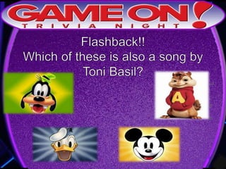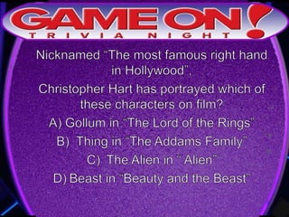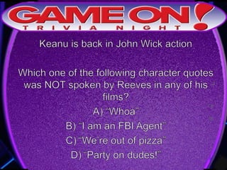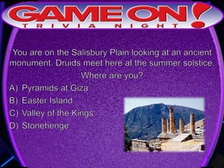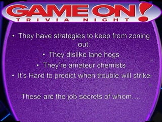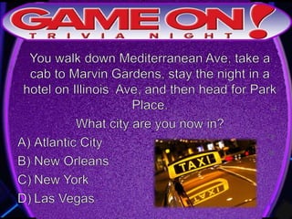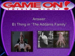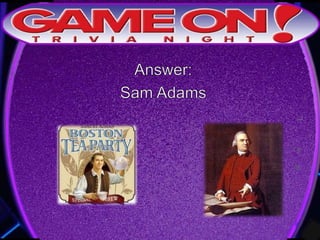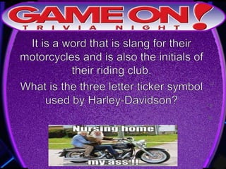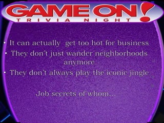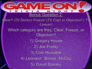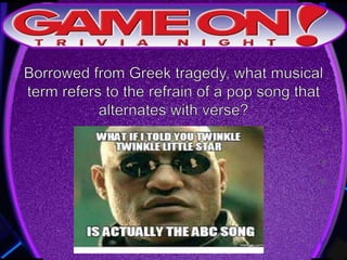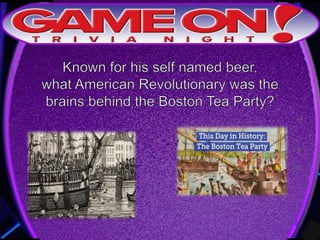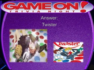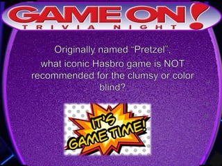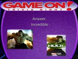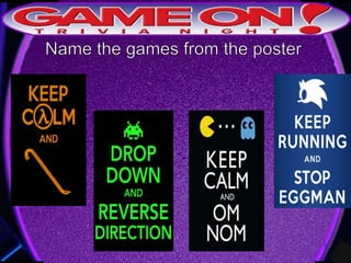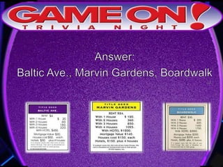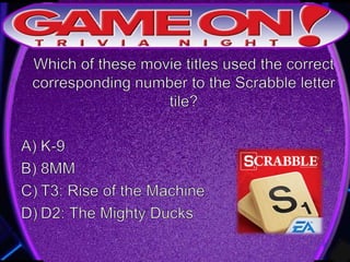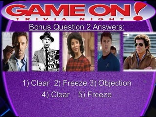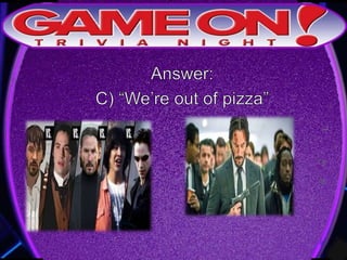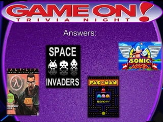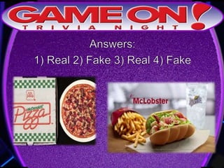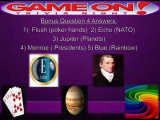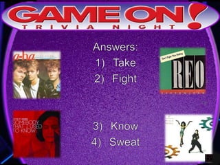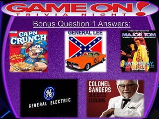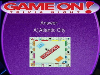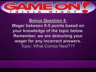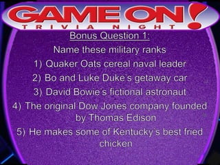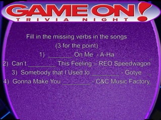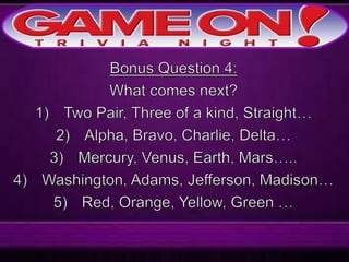 The document outlines the rules for a trivia game. Players must come up with a team name, answer questions on the front of an answer sheet, and bonus questions on the back. No cellphones are allowed during the game. A 5 minute break is provided for players to grab food and drinks. Teams can earn a free point by adding their photo and name to the GameOn Trivia Instagram and tagging the account.