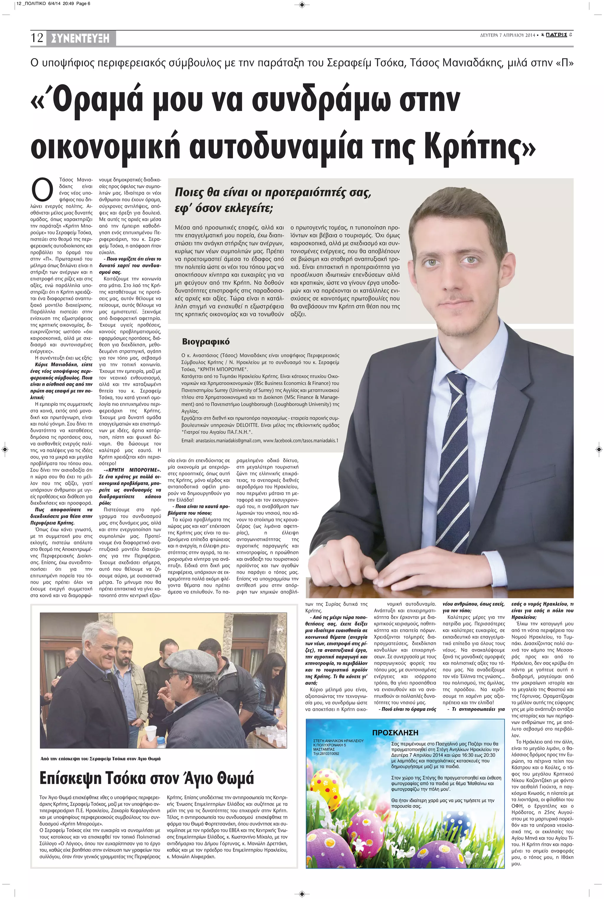 Ο υποψήφιος περιφερειακός σύμβουλος με την παράταξη του Σεραφείμ Τσόκα, Τάσος Μανιαδάκης, μιλά στην «Π»