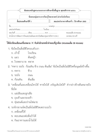 ข้อสอบกลุ่มสาระการเรียนรู้วิทยาศาสตร์ ป.1 1530617008 1 ให้นักเรียนเขียนเครื่องหมาย ✕ ทับตัวอักษรหน้าค�ำตอบที่ถูกต้อง (คะแนนเต็ม 30 คะแนน) ข้อสอบหลักสูตรแกนกลางการศึกษาขั้นพื้นฐาน พุทธศักราช ๒๕๕๑ ข้อสอบกลุ่มสาระการเรียนรู้วิทยาศาสตร์ (ส�ำหรับนักเรียน) ชั้นประถมศึกษาปีที่ 1 สอบประจ�ำภาคการศึกษาที่ 1 ปีการศึกษา 2553 ชื่อ……………………………………………………………………………… นามสกุล ………………………….………………………………… เลขประจ�ำตัวสอบ ……………………………………………… โรงเรียน ……………………..………………………………………………… สอบวันที่ ………………………… เดือน ………………………… พ.ศ. ………………… คะแนนเต็ม 30 คะแนน ฝ่ายโครงการพัฒนาการวัดและประเมินผล สถาบันพัฒนาคุณภาพวิชาการ (พว.) เวลาสอบ 60 นาที 1. ข้อใดเป็นสิ่งมีชีวิตรอบตัวเรา ก. เก้าอี้ โรงเรียน ข. แมว ต้นหญ้า ค. โรงพยาบาล ตลาด 2. “ทหาร รถถัง ก้อนหิน ช้าง ถนน ต้นเข็ม” ข้อใดเป็นสิ่งไม่มีชีวิตที่มนุษย์สร้างขึ้น ก. ทหาร ช้าง ข. รถถัง ถนน ค. ก้อนหิน ต้นเข็ม 3. “เคลื่อนที่และเคลื่อนไหวได้ หายใจได้ เจริญเติบโตได้” ค�ำกล่าวข้างต้นหมายถึง ข้อใด ก. แม่เสือและลูกเสือ ข. ถุงเท้าและรองเท้า ค. หุ่นยนต์และถ่านไฟฉาย 4. รถจักรยานจัดเป็นสิ่งไม่มีชีวิตเพราะอะไร ก. เคลื่อนที่ได้ ข. ตอบสนองต่อสิ่งเร้าได้ ค. กินอาหารและน�้ำไม่ได้