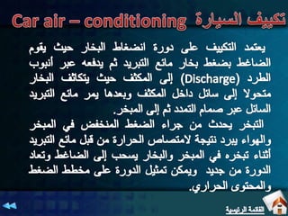 توفر الوثيقة معلومات حول مكونات نظام تكييف الهواء، بما في ذلك المبخر، المكثف، والضاغط. كما تتناول كيفية عمل هذه المكونات معًا لتحقيق أداء فعال. تشير الأرقام الموجودة في النص إلى ترتيب أو تصنيف عناصر معينة ضمن النظام.