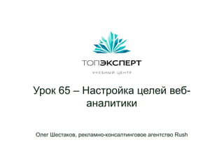 Документ обсуждает важность настройки целей в веб-аналитике для оценки эффективности онлайн-маркетинга и конверсии. Олег Шестаков делится опытом использования Google Analytics и Яндекс.Метрики, а также советует, какие цели можно отслеживать и какие KPI важно учитывать. Также упоминается работа команды Rush Agency и обучающая программа по SEO.