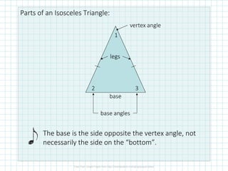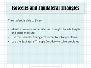 This document discusses isosceles and equilateral triangles. It defines isosceles triangles as triangles with two congruent sides and equilateral triangles as triangles with three congruent sides. The Isosceles Triangle Theorem and its converse state that if two sides or angles of a triangle are congruent, then the opposite angles or sides are also congruent. Similarly, the Equilateral Triangle Corollary and its converse state that if a triangle is equilateral, it is also equiangular, and vice versa. Examples are given to demonstrate using these properties to solve for missing angle measures.