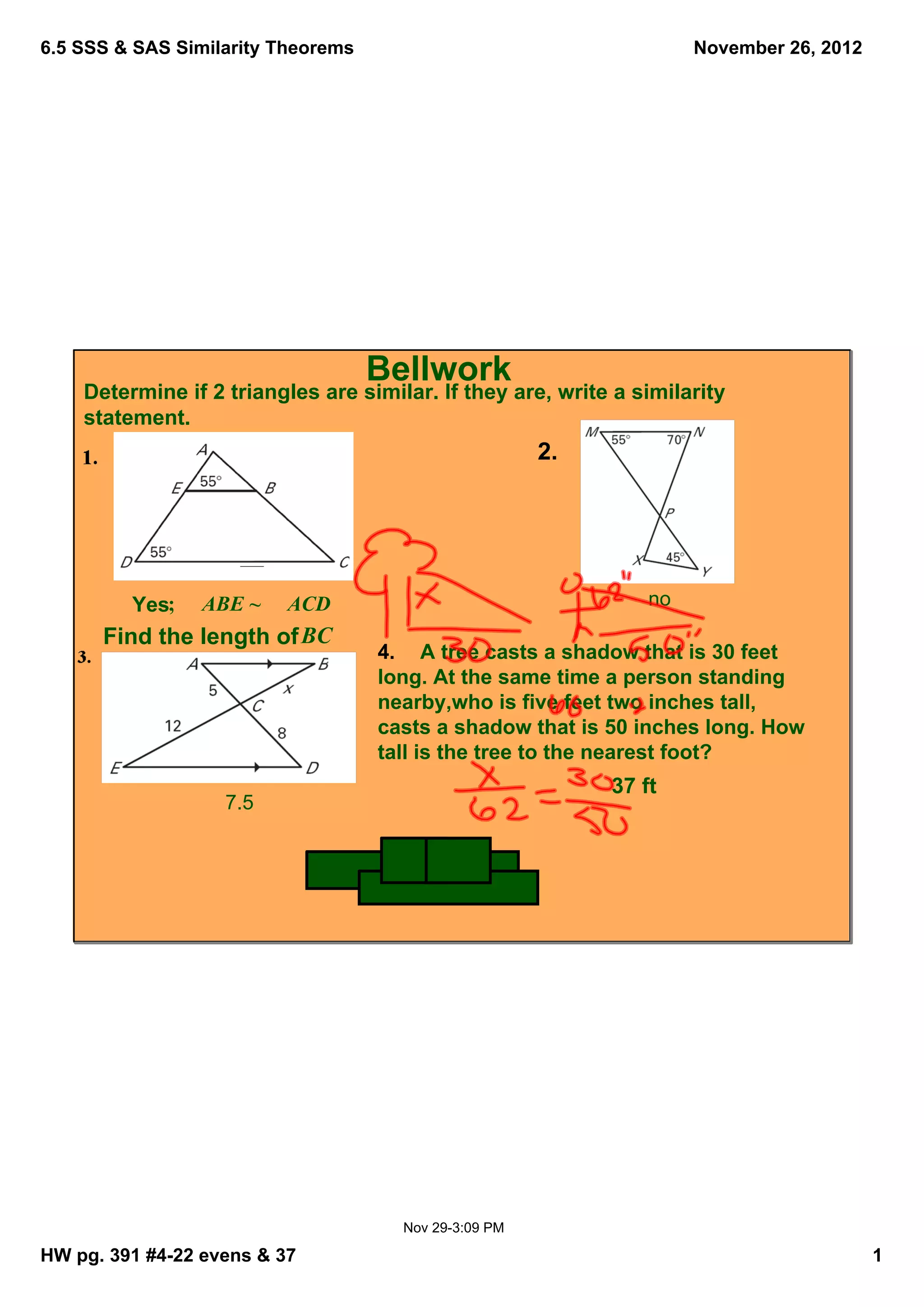 This document discusses two theorems for proving triangle similarity: the SSS Similarity Theorem and the SAS Similarity Theorem. The SSS Similarity Theorem states that if three corresponding sides of two triangles are proportional, then the triangles are similar. The SAS Similarity Theorem states that if one angle of one triangle is congruent to one angle of another triangle and their included sides are proportional, then the triangles are similar. Examples are provided to illustrate each theorem.