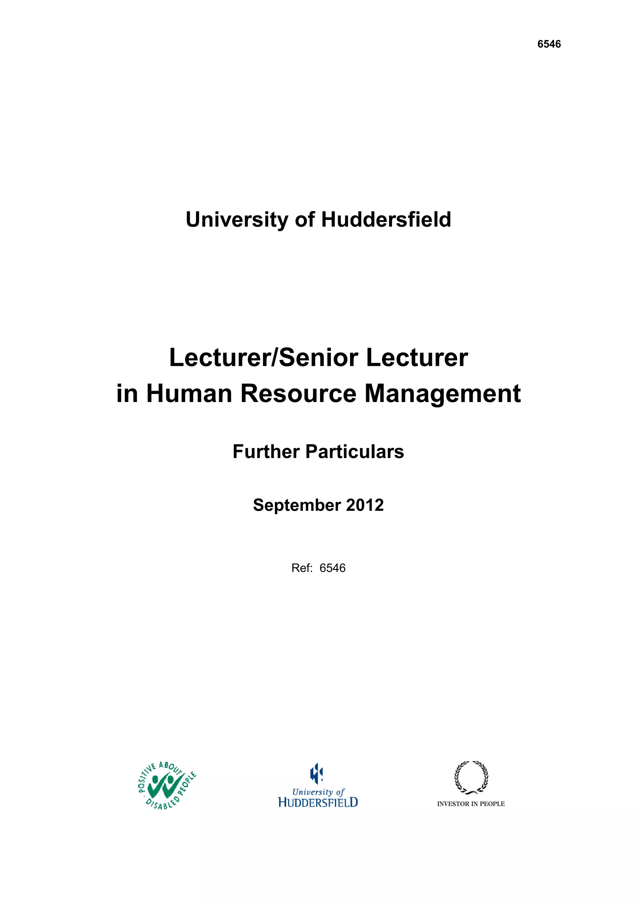 The document is a job posting for a Lecturer/Senior Lecturer in Human Resource Management at the University of Huddersfield. It provides details about the role, qualifications, experience, and responsibilities required. It also describes the benefits of the position and application process. The University of Huddersfield is seeking candidates to join its dynamic Business School to teach HRM and help expand its course offerings. Applications for the position are due by October 11th, with interviews scheduled for November 28th.