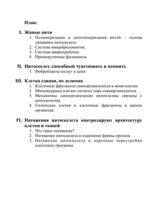 В реферате обсуждается клетка как сложная структура, главным образом, через призму цитоскелета, который состоит из микрофиламентов, микротрубочек и промежуточных филаментов, и его роли в динамике клеточных процессов. Также рассматриваются механизмы полимеризации и деполимеризации этих нитей, которые обеспечивают изменения формы клеток и их взаимодействие. Особое внимание уделяется принципу динамической нестабильности, позволяющему клеткам адаптироваться к различным условиям и выполнять свои функции.