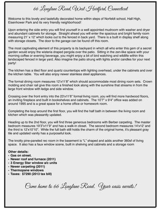This document describes a charming home located at 66 Longlane Road, West Hartford, CT, featuring tastefully decorated spaces, a spacious family room, and a captivating backyard with a pergola. Key amenities include a modern kitchen with quartz countertops, a cozy living room with a fireplace, and three generous bedrooms on the second floor. Additional features include a finished basement and recent updates such as a new roof and furnace.