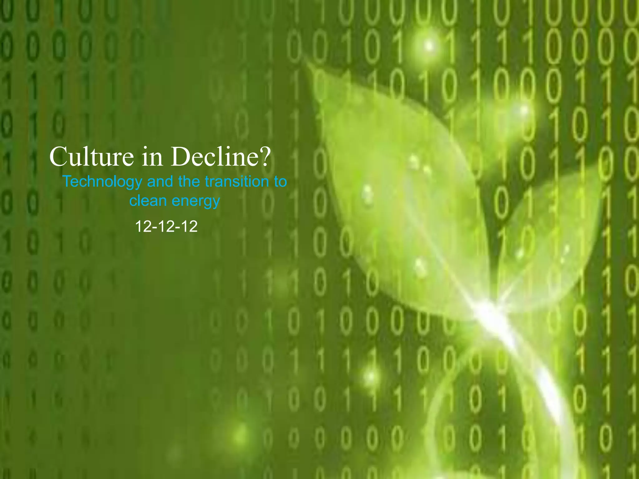 The document discusses the transition to clean energy and sustainable technologies. It provides examples of innovative clean energy technologies and summarizes benefits of investing in solar energy research, including a triple return on investment, 50% reduction in solar costs, and significant emissions reductions. However, it notes that political and economic factors have prevented a full transition, with politicians influenced by fossil fuel industries resisting climate policies due to perceived economic threats. It calls for governments and citizens to transform systems from a corporatocracy to a true democracy that supports well-being and sustainability.