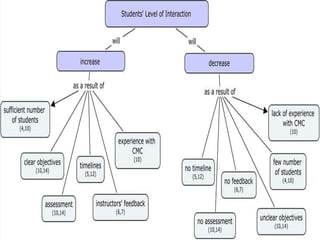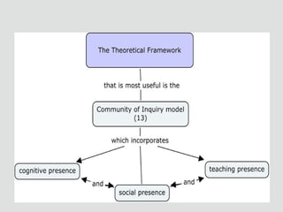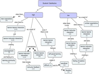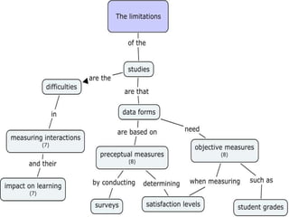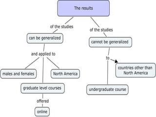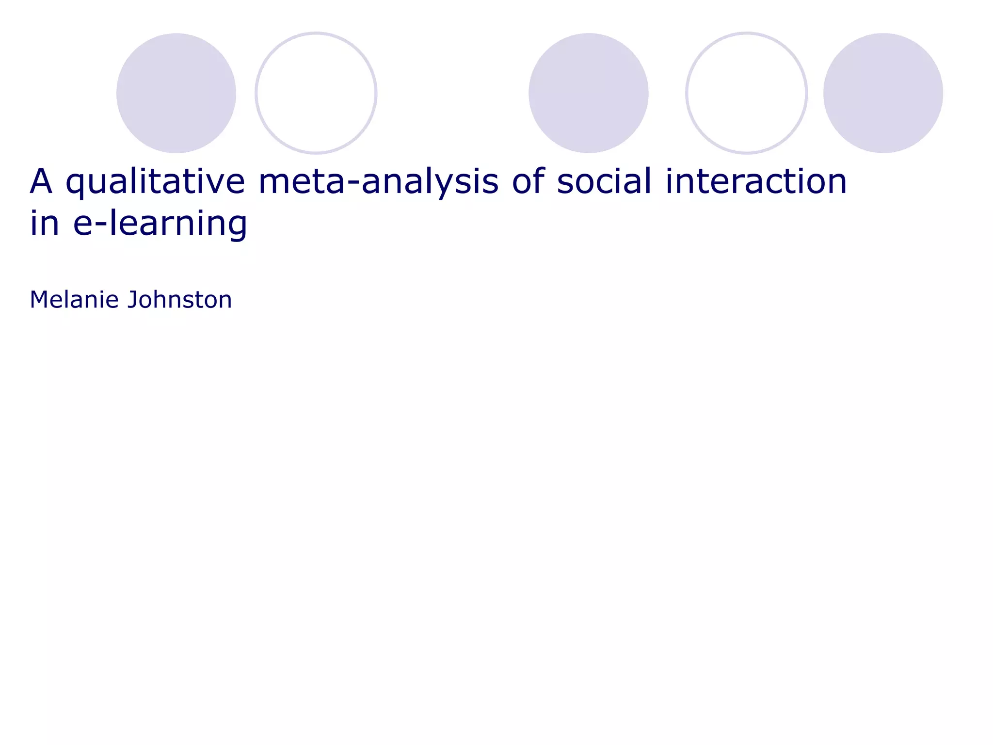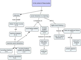 The document summarizes a qualitative meta-analysis of 15 studies on social interaction in e-learning. It describes the meta-analysis methods, which involved identifying relevant studies from journals, synthesizing them according to purpose, methods, findings and conclusions, and analyzing the synthesis to determine similarities, differences and gaps. It then presents the main findings, including the conceptual frameworks and methods used in each study, such as data collection and participants.