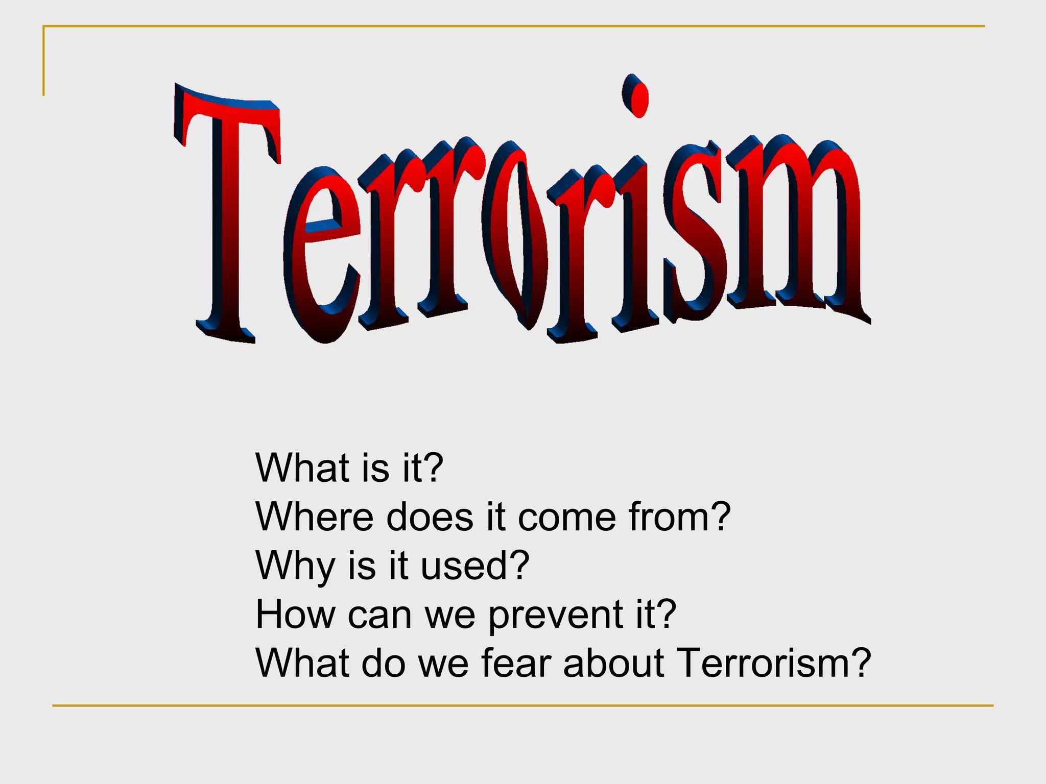 Terrorism is an unlawful act of violence or intimidation used to achieve political, religious, or ideological goals. It has a long history dating back to resistance against Roman occupation. In the modern era, terrorism emerged during the French Revolution and has since been used by both states and non-state groups in conflicts and wars. While terrorism poses psychological fears, statistically the risk of death from a terrorist attack remains relatively low compared to other causes of death in the United States.