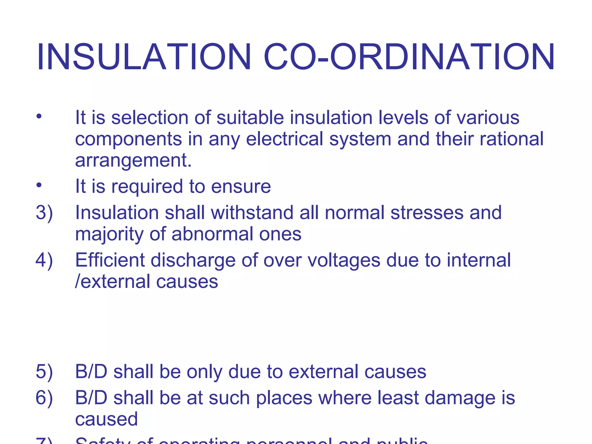 This document discusses insulation coordination for electrical systems. It defines insulation coordination as selecting suitable insulation levels for system components and arranging them rationally. The goals of insulation coordination are to ensure insulation can withstand normal and abnormal stresses and efficiently discharge over voltages. It also discusses determining live insulation levels, equipment BIL levels, and selecting lightning arrestors. Various insulation levels for lines and equipment are recommended based on system voltage.