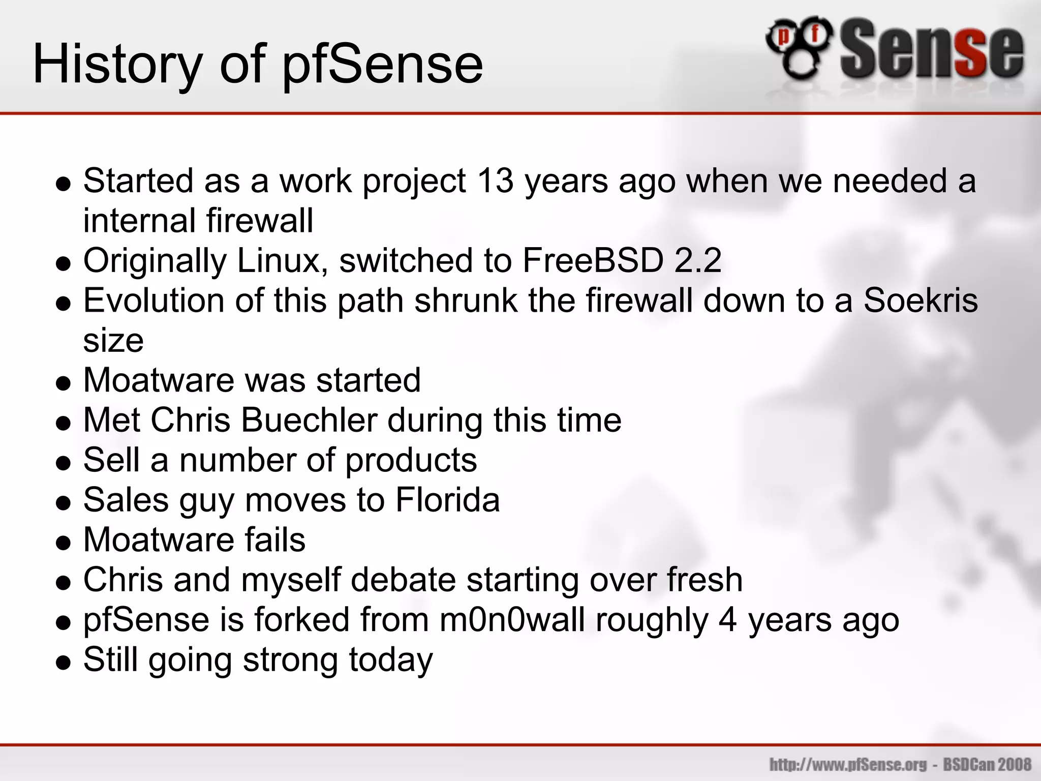 The document provides an overview of pfSense, an open source firewall and routing platform based on FreeBSD. It discusses the history and evolution of pfSense, hardware requirements, common deployment scenarios, and key features such as firewall rules, NAT, VPNs, traffic shaping, wireless access points, and high availability using CARP. The document also advertises a live demo of pfSense installation and configuration.