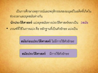 การแบ่งยุคสมัยทางประวัติศาสตร์ นำเสนอ อ.ปรางสุวรรณ ศักดิ์โสภณกุล จัดทำโดย น.ส.นฤภร โชติวงศานันต์ ม.6.7 เลขที่ 4 น.ส.พิริยาภรณ์ อาจหาญพิชิต ม.6.7 เลขที่ 10 ปีการศึกษา2557 โรงเรียนสตรีวิทยา