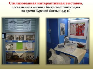 Документ описывает фоторепортаж и стилизованную интерактивную выставку, посвященную жизни и быту советских солдат во время Курской битвы в 1943 году, которая приурочена к 70-летию события. Он содержит контактную информацию представителей выставки из белгородской библиотеки, включая телефон и электронную почту. Основное внимание уделяется культурному значению выставки и ее образовательным аспектам.