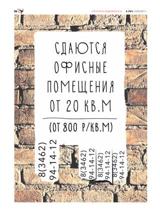 Документ содержит информацию о продаже недвижимости в Сургуте и окрестностях, включая предложения квартир и условия ипотеки. Кроме того, упоминаются услуги Росреестра и информация о плате за предоставление сведений из ЕГРН. Также представлены контактные данные агентств и застройщиков, предлагающих выгодные условия для клиентов.