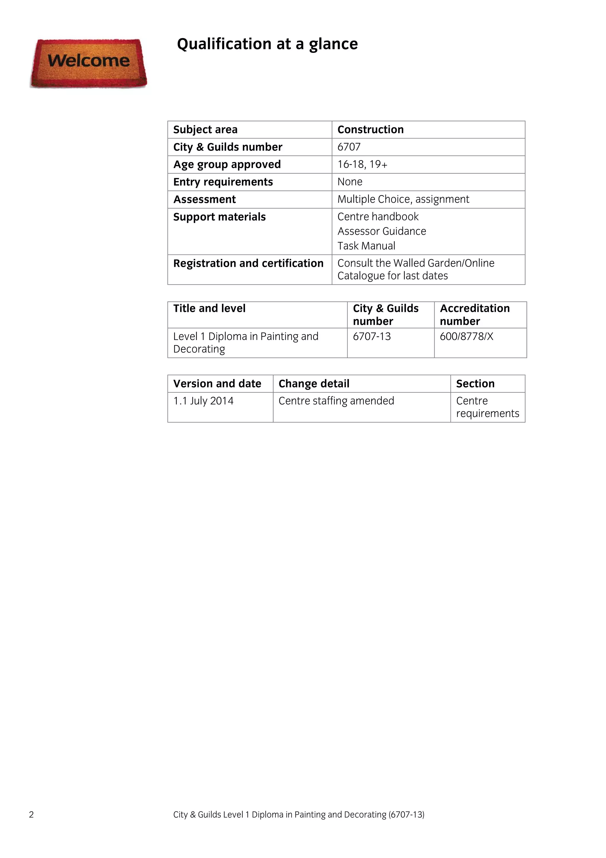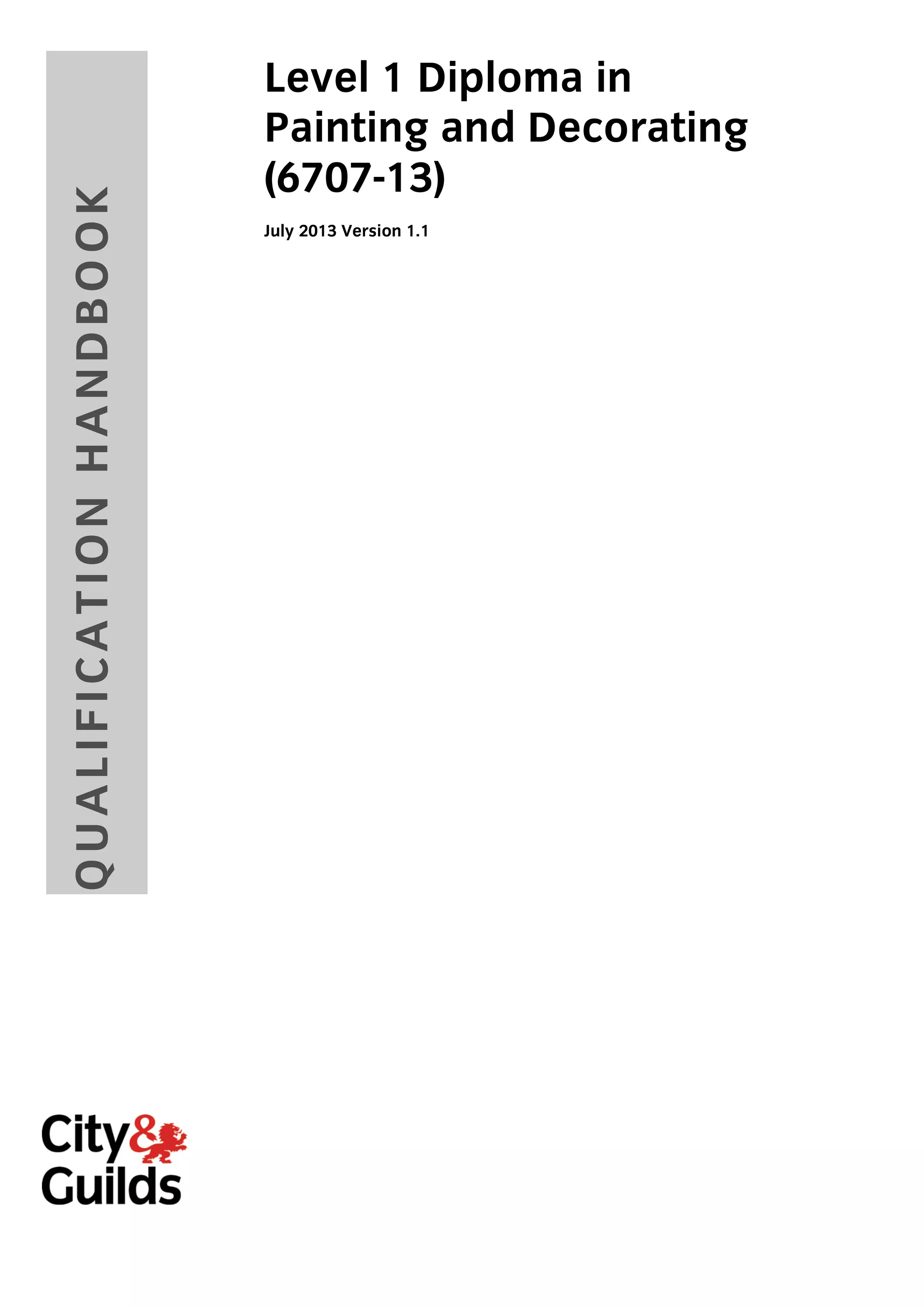 The document provides information about a Level 1 Diploma in Painting and Decorating qualification, including:
