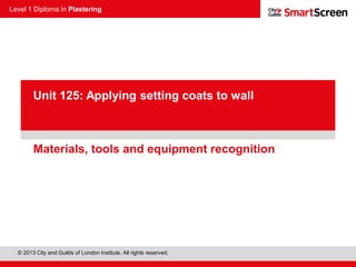 This document provides information about applying finish coats for plastering. It describes different types of finish plasters, including multi-finish, board finish, durafinish, spray finish, and MPFinish. It also discusses tools and equipment used for applying finish coats, such as finishing trowels, hawk/hand boards, gauging trowels, and buckets. Cleaning tools and equipment is emphasized to avoid contamination. Trowel blades and their parts like the toe, heel, and tang are outlined.