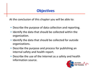 This chapter discusses information management for occupational safety and health in emergency services. It covers collecting data internally on injuries, accidents, medical histories and test results to analyze safety trends and evaluate programs. Data is also reported externally to agencies like OSHA, NFPA and state workers' compensation boards. The chapter outlines publishing an annual internal safety report to communicate accomplishments, goals and injury analyses. It also discusses using the internet to research safety policies from other departments.