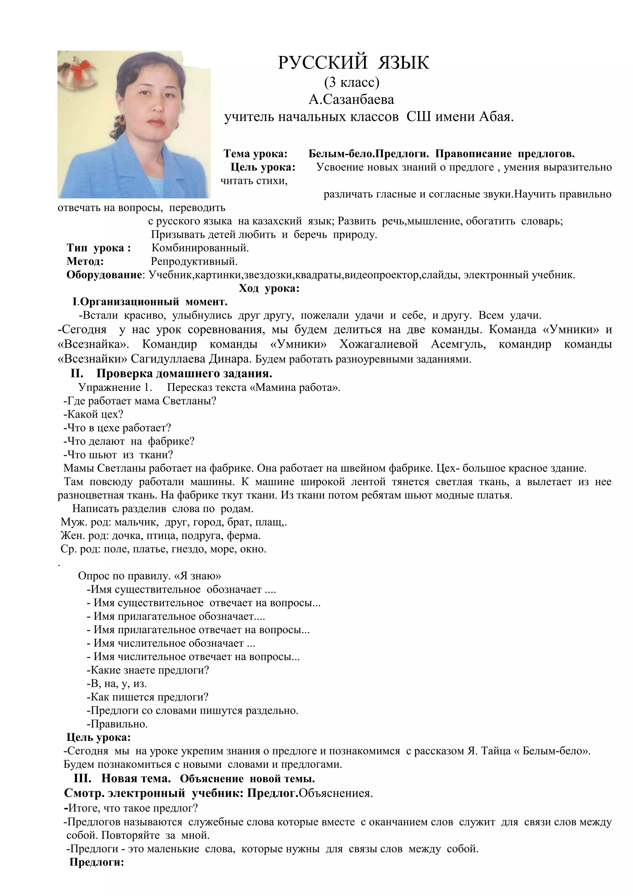 Документ описывает план урока русского языка для 3 класса, целью которого является изучение предлогов и их правописания. Урок включает организационные моменты, проверку домашнего задания, объяснение новой темы и различные упражнения для укрепления знаний. Также предусмотрено командное соревнование и тестирование для оценки усвоения материала.