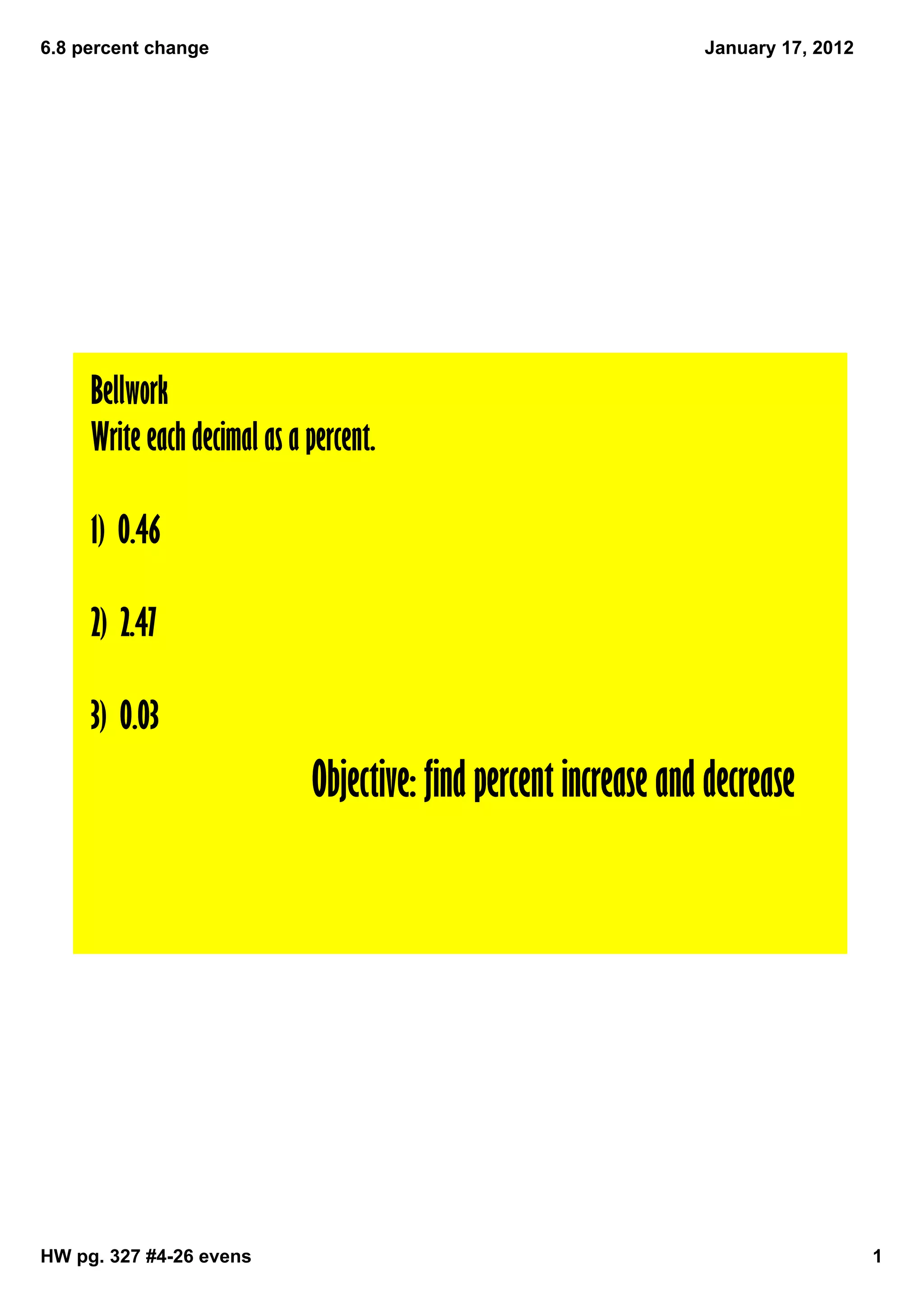 The document contains math problems about calculating percent change. It asks students to find the percent increase or decrease in various scenarios, such as finding the percent increase from 4 to 7.5 or the percent decrease from 1,500 to 1,416. It also provides data on annual municipal solid waste production in the United States from 1960 to 2000 and asks students to calculate the percent increase from 1960 to 1990.