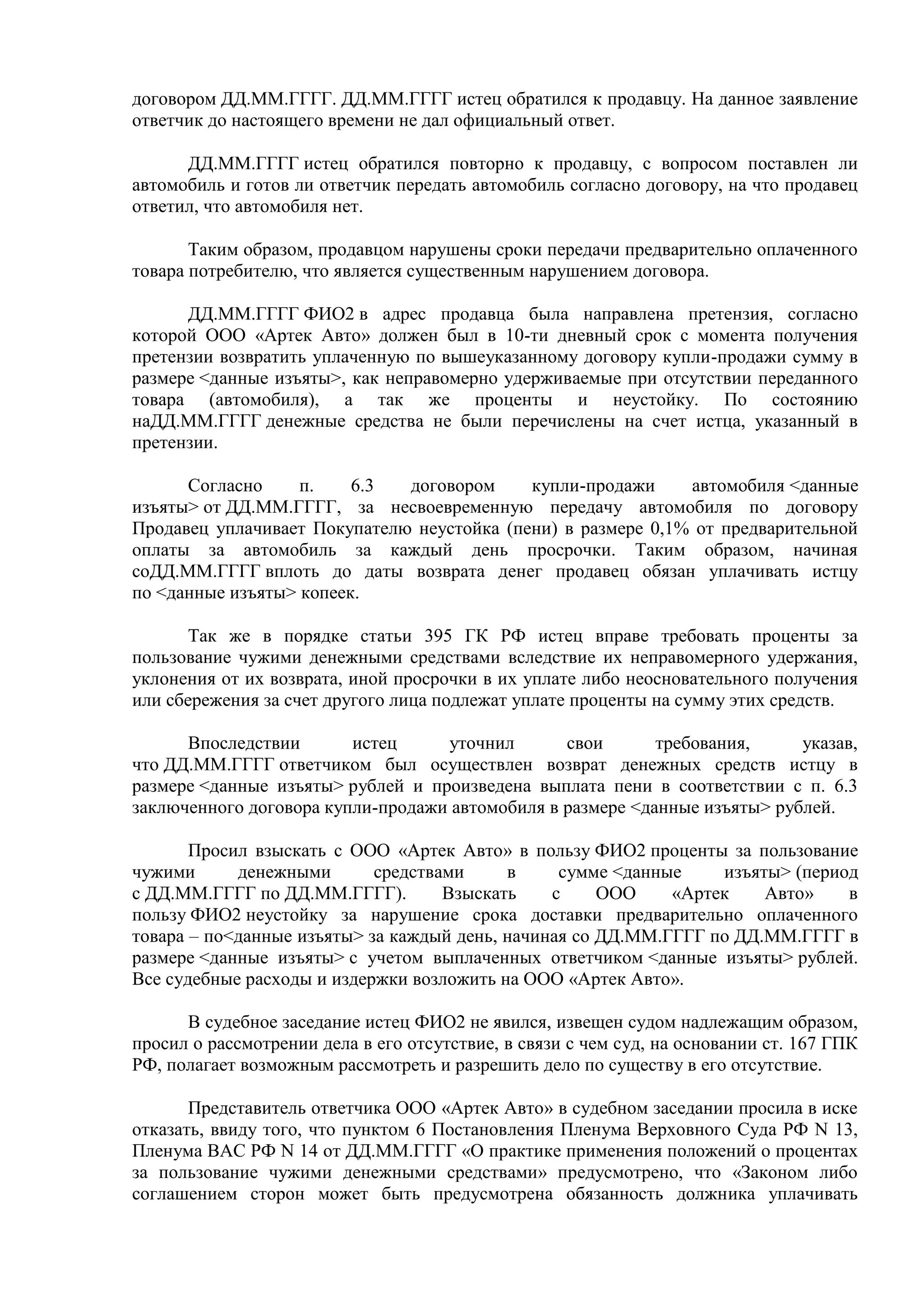 Судебное решение по гражданскому делу касается иска истца к ООО 'Артек Авто' о взыскании денежных средств, неустойки и процентов за пользование чужими средствами из-за неисполнения обязательств по договору купли-продажи автомобиля. Суд установил, что продавец не выполнил обязательства по передаче автомобиля в установленный срок и обязал ответчика выплатить истцу сумму, а также проценты за пользование денежными средствами. Суд удовлетворил требования истца о неустойке и процентах, указав, что двойная ответственность по этим требованиям не нарушает законодательство.