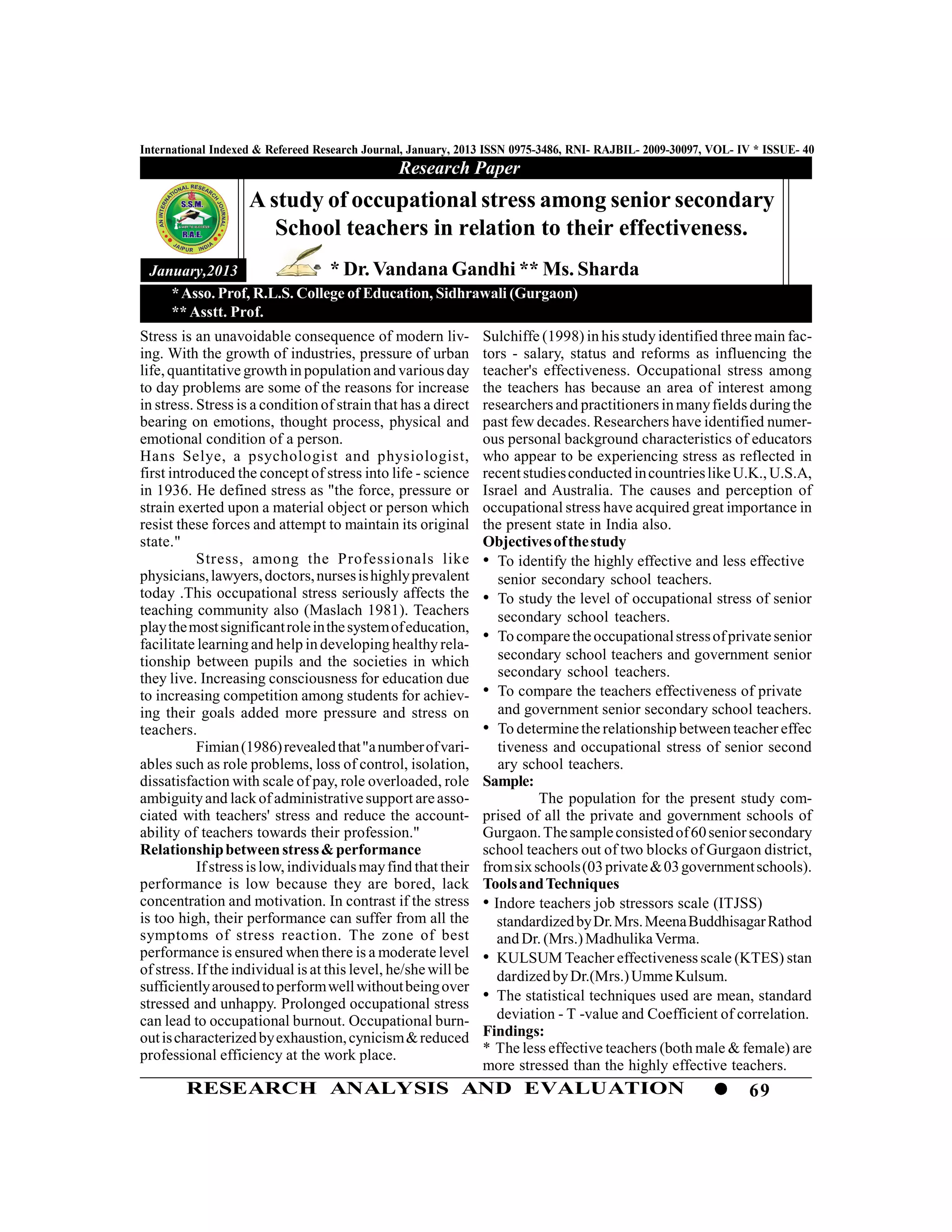 This study examined occupational stress and effectiveness among senior secondary school teachers in India. The researchers found that less effective teachers, both male and female, reported higher levels of occupational stress than more effective teachers. Female teachers experienced more stress than male teachers, with 90% of female teachers found to be stressed. Higher occupational stress was correlated with lower teaching effectiveness. The four main sources of occupational stress identified were role conflict, role ambiguity, poor interpersonal relationships, and heavy workload. The study suggests addressing sources of stress in order to improve teacher enthusiasm, accountability, and job satisfaction.