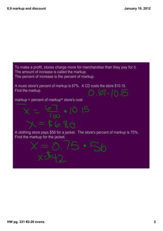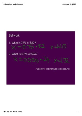This document provides instructions on calculating markups and discounts. It defines markup as the amount of increase over the store's cost, and discount as the amount of decrease from the regular price. It gives examples of finding the markup on items when given the store's cost and percent of markup. Similarly, it provides examples of finding the discount and sale price on items originally priced at a regular price when given the percent discounted. The goal is to practice calculating markups, discounts, selling prices, and sale prices.