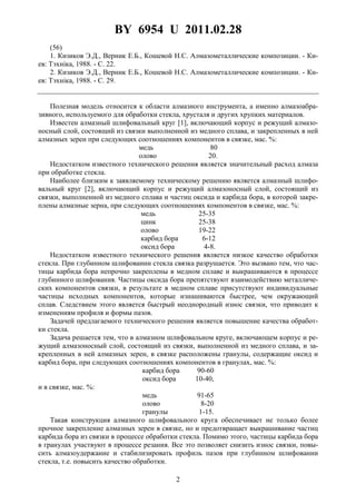 Документ описывает полезную модель алмазного шлифовального круга, который включает медный сплав и гранулы из оксида и карбида бора для повышения качества обработки стекла и снижения расхода алмаза. Предлагаемая конструкция улучшает крепление алмазных зерен и предотвращает их выкрашивание, что ведет к стабильности профиля и меньшему износу инструмента. Результаты испытаний показывают улучшенные показатели качества обработки по сравнению с известными инструментами.