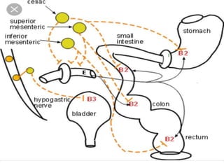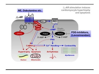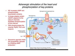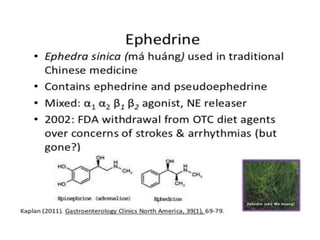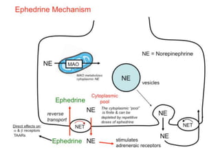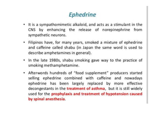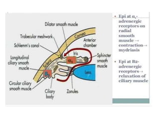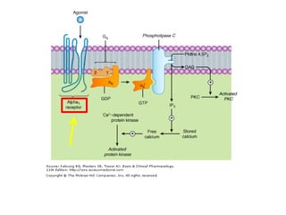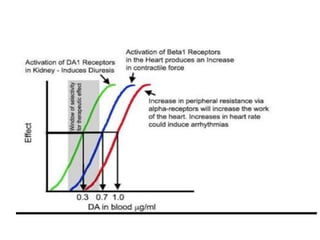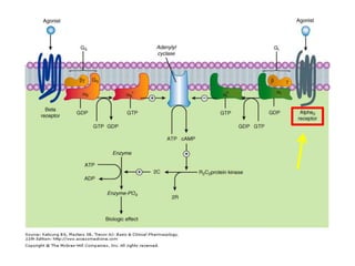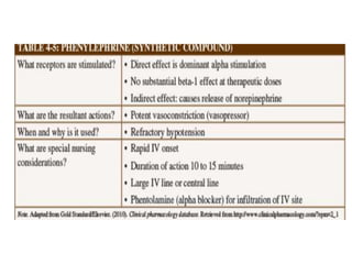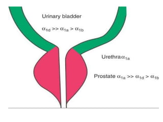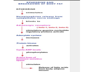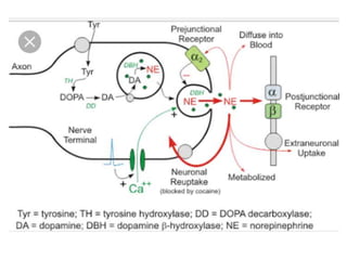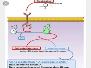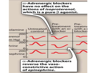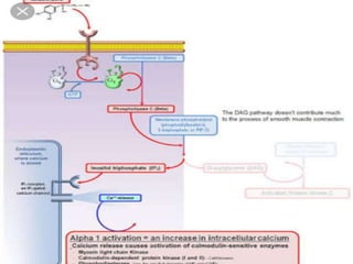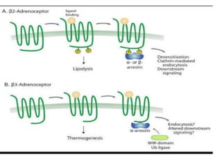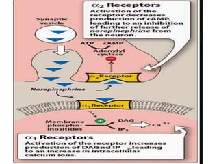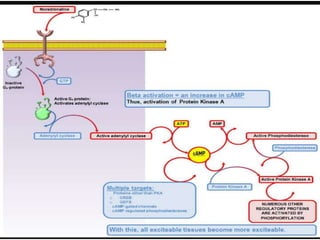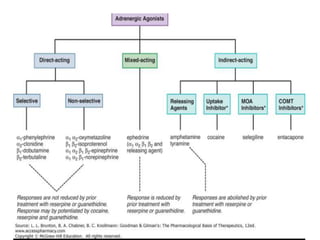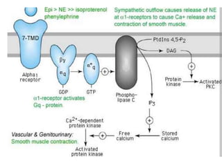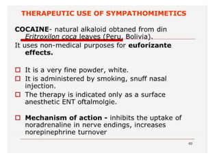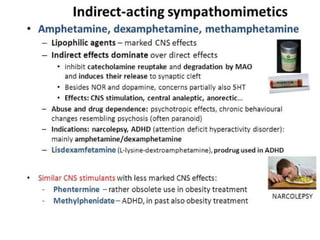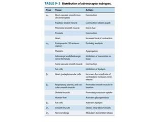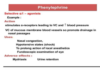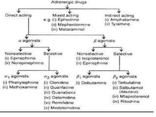 The document discusses adrenoceptor agonists and sympathormimetic drugs. It begins by overviewing the sympathetic nervous system and adrenergic receptors. It then describes the two main types of adrenergic receptors, α and β, which are G protein-coupled receptors. It also discusses the subtypes and selectivity of agonists and antagonists. Finally, it summarizes the organ system effects of sympathormimetic drugs and their mechanisms of action.