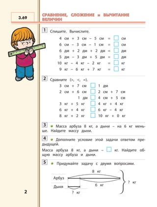 Документ представляет собой учебный материал для 1 класса, следуя федеральным государственным образовательным стандартам. Он включает различные задания по математике, такие как сложение, вычитание, сравнение и измерение масс и объемов, с акцентом на развитие предметных и познавательных умений учащихся. Также документ содержит примеры задач и упражнения, направленные на формирование навыков работы с величинами и единицами измерений.