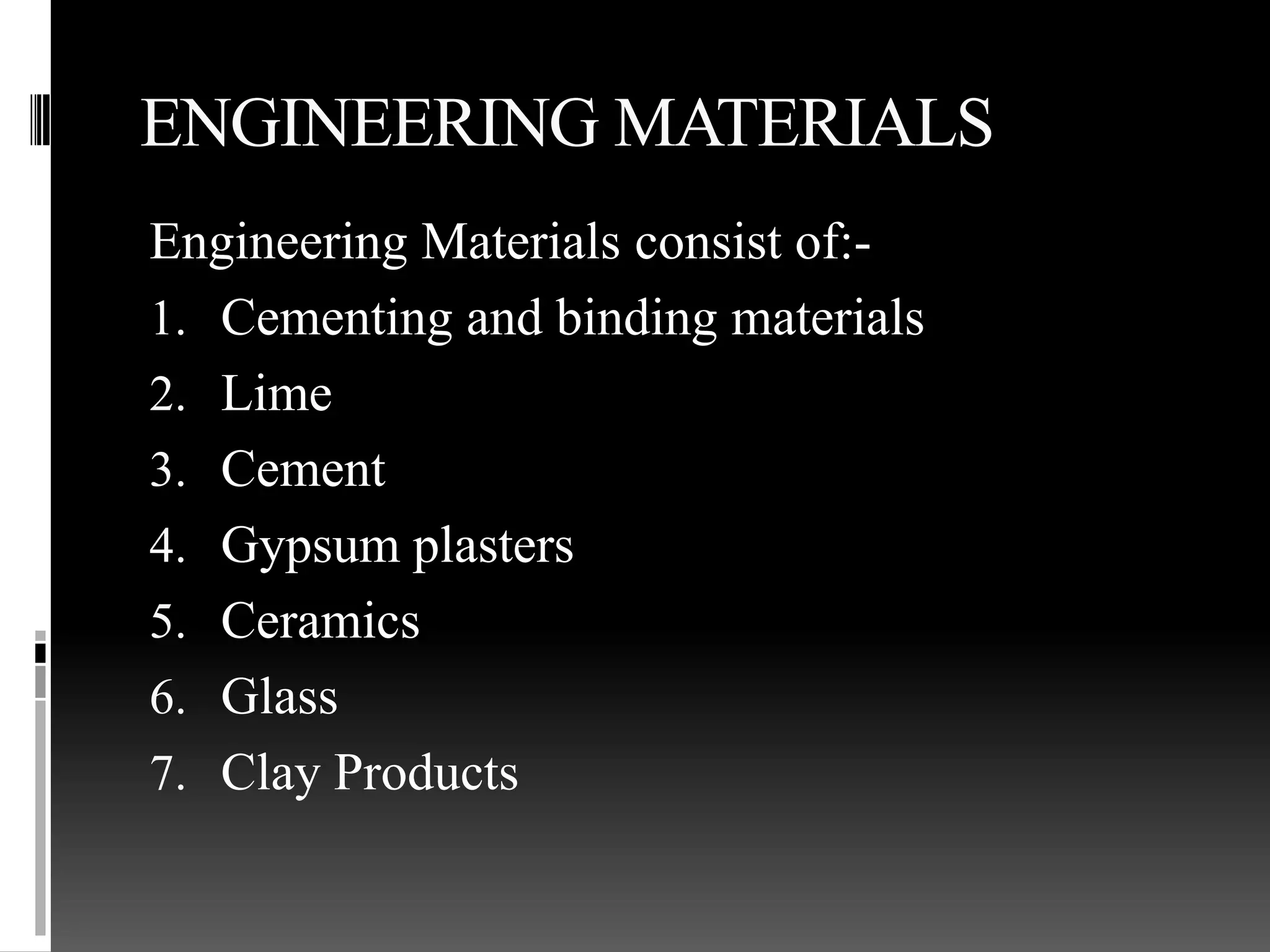 Engineering materials include cementing materials, lime, cement, gypsum plasters, ceramics, glass, clay products, refractories, abrasives, composites, adhesives, lubricants, rocket fuels, and insulators. Their properties and applications depend on their chemical, electrical, mechanical, optical, physical, thermal, and technological characteristics. Common engineering materials are discussed, including their composition, manufacturing processes, properties, and uses.