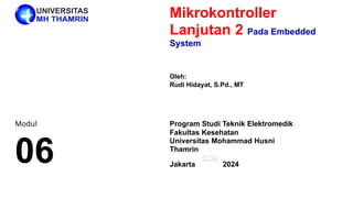 Dokumen ini membahas tentang modul mikrokontroler lanjutan 2 dalam sistem embedded, yang mencakup analisis dan aplikasi IC L293D sebagai driver motor DC dan sensor photodiode. IC L293D dirancang khusus untuk mengendalikan motor DC dengan fitur canggih, sementara sensor photodiode berfungsi mendeteksi cahaya dan menghasilkan arus yang berkaitan dengan intensitas cahaya. Selain itu, dokumen menjelaskan aplikasinya dalam bidang medis dan karakteristik masing-masing komponen tersebut.