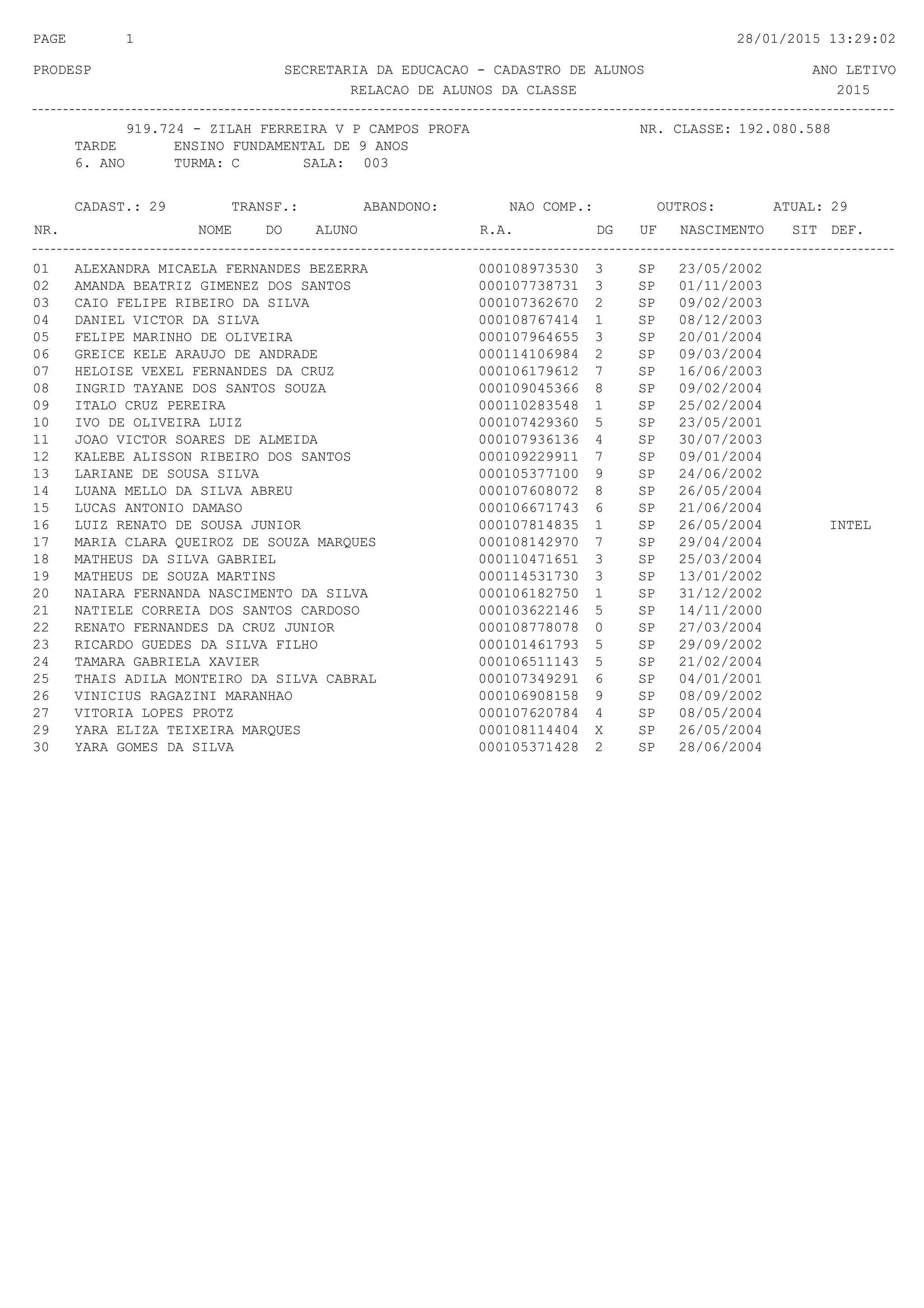ALUNO R.A. UF NASCIMENTO SIT DEF. CADAST.: 29 TRANSF.: ABANDONO: NAO COMP.: OUTROS: ATUAL: 29 6. ANO TURMA: C SALA: 003 TARDE ENSINO FUNDAMENTAL DE 9 ANOS 919.724 - ZILAH FERREIRA V P CAMPOS PROFA NR. CLASSE: 192.080.588 2015RELACAO DE ALUNOS DA CLASSE SECRETARIA DA EDUCACAO - CADASTRO DE ALUNOS ANO LETIVO 28/01/2015 13:29:02 PRODESP PAGE 1 DG ALEXANDRA MICAELA FERNANDES BEZERRA 00010897353001 3 SP 23/05/2002 AMANDA BEATRIZ GIMENEZ DOS SANTOS 00010773873102 3 SP 01/11/2003 CAIO FELIPE RIBEIRO DA SILVA 00010736267003 2 SP 09/02/2003 DANIEL VICTOR DA SILVA 00010876741404 1 SP 08/12/2003 FELIPE MARINHO DE OLIVEIRA 00010796465505 3 SP 20/01/2004 GREICE KELE ARAUJO DE ANDRADE 00011410698406 2 SP 09/03/2004 HELOISE VEXEL FERNANDES DA CRUZ 00010617961207 7 SP 16/06/2003 INGRID TAYANE DOS SANTOS SOUZA 00010904536608 8 SP 09/02/2004 ITALO CRUZ PEREIRA 00011028354809 1 SP 25/02/2004 IVO DE OLIVEIRA LUIZ 00010742936010 5 SP 23/05/2001 JOAO VICTOR SOARES DE ALMEIDA 00010793613611 4 SP 30/07/2003 KALEBE ALISSON RIBEIRO DOS SANTOS 00010922991112 7 SP 09/01/2004 LARIANE DE SOUSA SILVA 00010537710013 9 SP 24/06/2002 LUANA MELLO DA SILVA ABREU 00010760807214 8 SP 26/05/2004 LUCAS ANTONIO DAMASO 00010667174315 6 SP 21/06/2004 LUIZ RENATO DE SOUSA JUNIOR 00010781483516 1 SP 26/05/2004 INTEL MARIA CLARA QUEIROZ DE SOUZA MARQUES 00010814297017 7 SP 29/04/2004 MATHEUS DA SILVA GABRIEL 00011047165118 3 SP 25/03/2004 MATHEUS DE SOUZA MARTINS 00011453173019 3 SP 13/01/2002 NAIARA FERNANDA NASCIMENTO DA SILVA 00010618275020 1 SP 31/12/2002 NATIELE CORREIA DOS SANTOS CARDOSO 00010362214621 5 SP 14/11/2000 RENATO FERNANDES DA CRUZ JUNIOR 00010877807822 0 SP 27/03/2004 RICARDO GUEDES DA SILVA FILHO 00010146179323 5 SP 29/09/2002 TAMARA GABRIELA XAVIER 00010651114324 5 SP 21/02/2004 THAIS ADILA MONTEIRO DA SILVA CABRAL 00010734929125 6 SP 04/01/2001 VINICIUS RAGAZINI MARANHAO 00010690815826 9 SP 08/09/2002 VITORIA LOPES PROTZ 00010762078427 4 SP 08/05/2004 YARA ELIZA TEIXEIRA MARQUES 00010811440429 X SP 26/05/2004 YARA GOMES DA SILVA 00010537142830 2 SP 28/06/2004