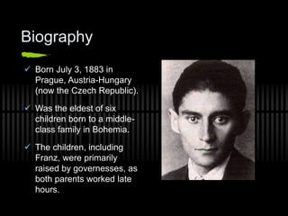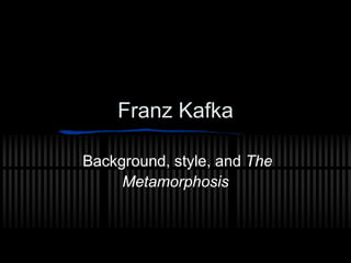Franz Kafka was a writer born in 1883 in Prague who is known for his existential and surreal stories. One of his most famous works is The Metamorphosis, which tells the story of Gregor Samsa, who wakes up one day transformed into a large insect. As Gregor deals with his new form and isolation from his family, themes of transformation, alienation, responsibility, and lack of free will emerge. Kafka's style incorporates absurdism, ambiguity, and dreamlike elements that influenced later surrealist and modernist works. The Metamorphosis has been interpreted through various philosophical lenses due to its surreal premise and exploration of the human condition.