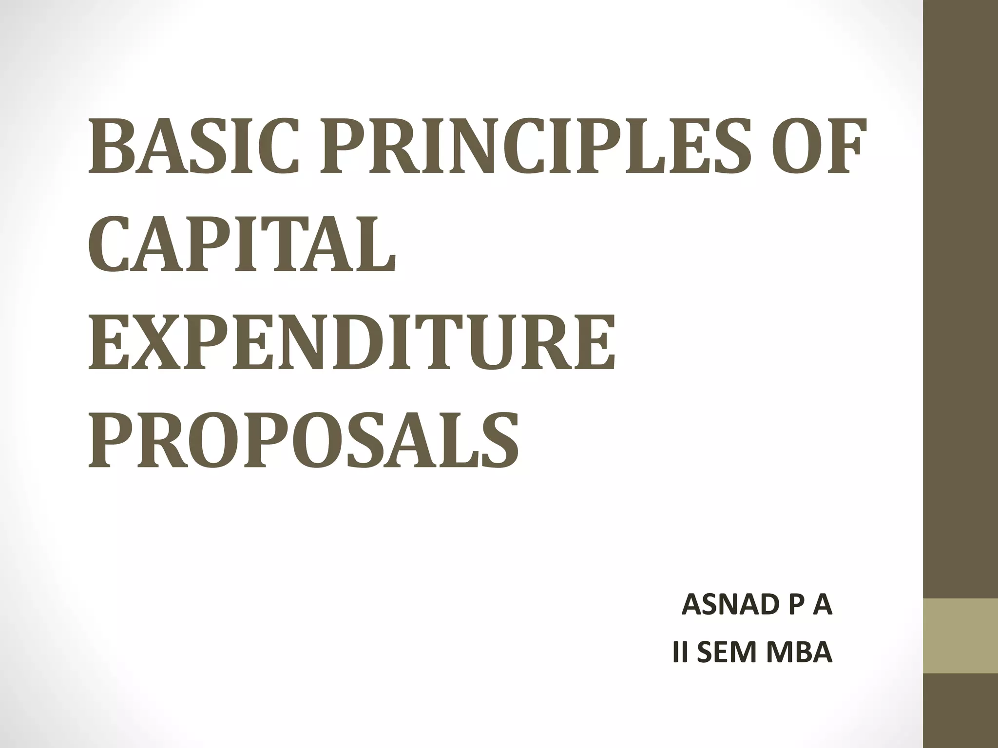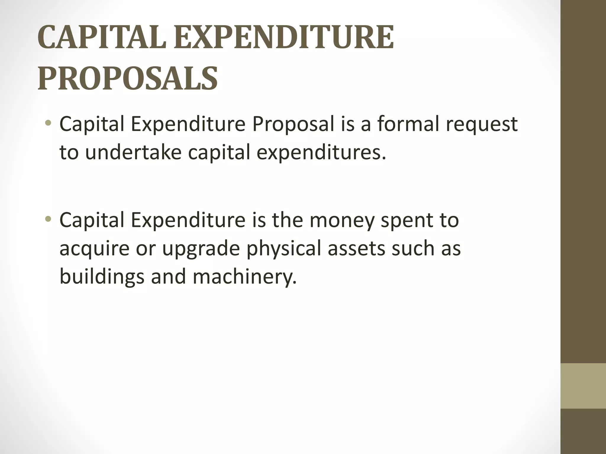 A capital expenditure proposal is a formal request to undertake projects to acquire or upgrade physical assets. The proposed projects will be ranked according to criteria like payback period, discounted payback method, net present value, and internal rate of return. There are different types of investment proposals such as mutually exclusive, contingent, and independent proposals as well as replacements. Key principles for capital expenditure proposals include carefully estimating costs, finding profitable opportunities, estimating future revenues and expenses, considering non-monetary factors, screening and selecting projects, and preparing necessary reports.