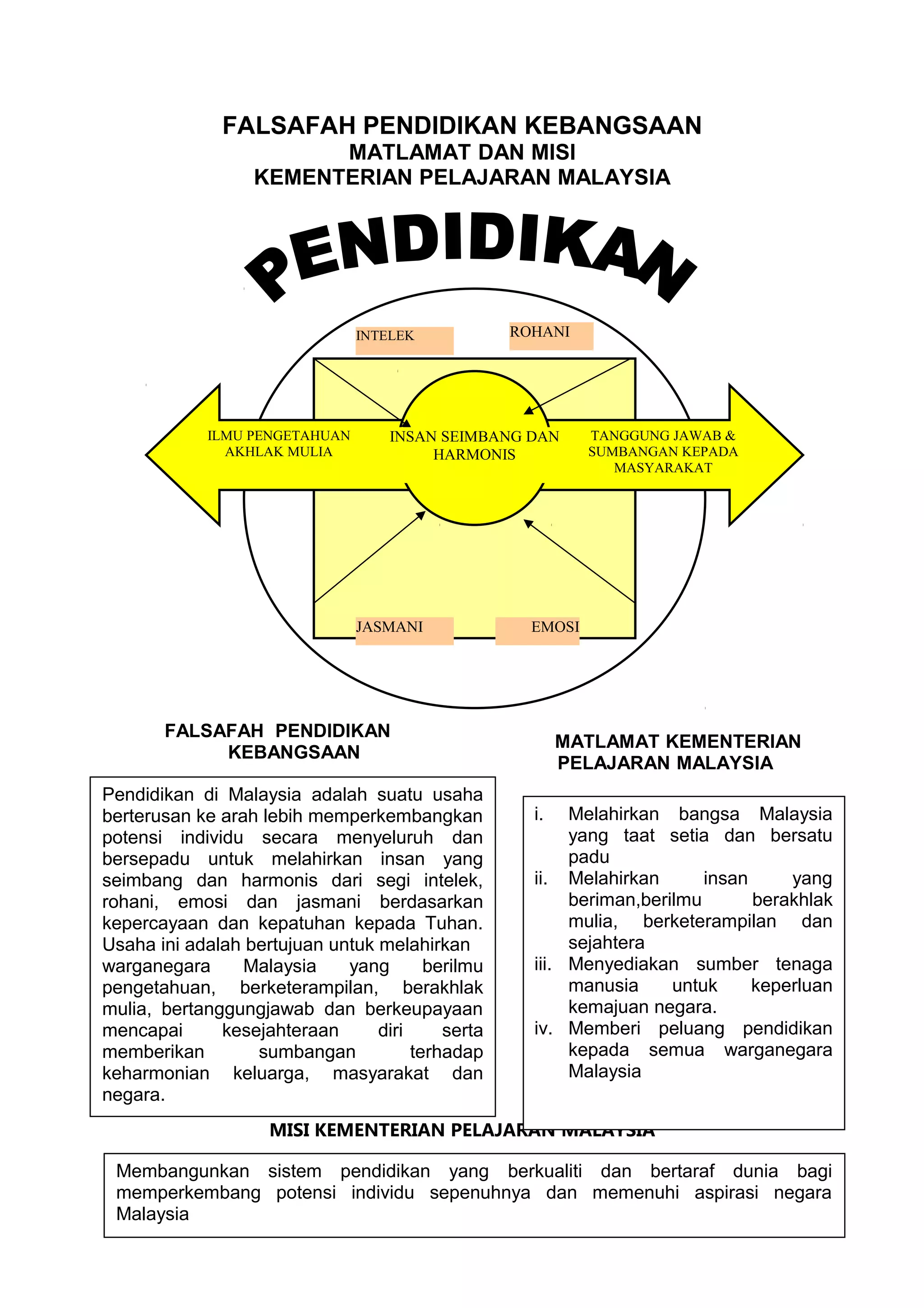 Dokumen ini menjelaskan falsafah pendidikan kebangsaan Malaysia yang bertujuan melahirkan individu seimbang dari segi intelek, rohani, dan jasmani. Misi Kementerian Pelajaran Malaysia adalah untuk membangunkan sistem pendidikan berkualiti yang dapat memenuhi potensi individu dan aspirasi negara. Hal ini juga bertujuan untuk meningkatkan keharmonian dalam masyarakat dan sumbangan kepada negara.